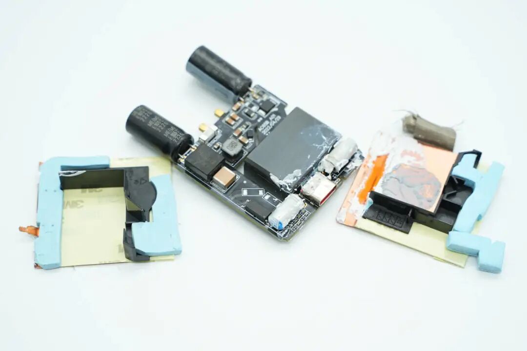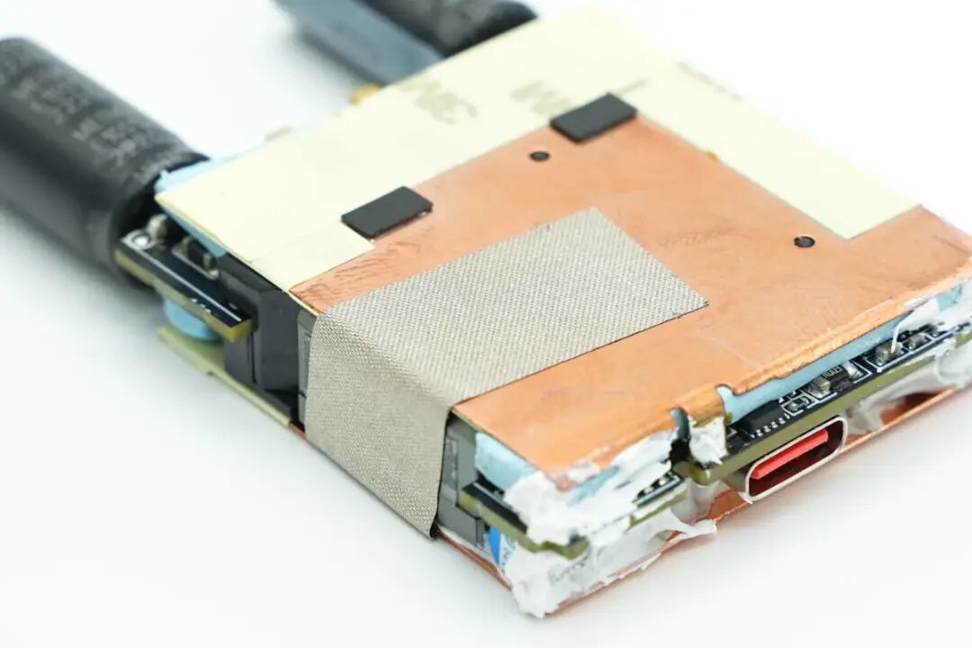 产品在散热方面的设计也很用心,采用纯铜散热片搭配导热垫进行散热,两块散热片贴有绝缘胶带和导电布保证安全,对应平面变压器磁芯区域涂有导热胶,进一步提升散热效果。平面变压器周边有塑料壳固定绝缘保护,细节到位。