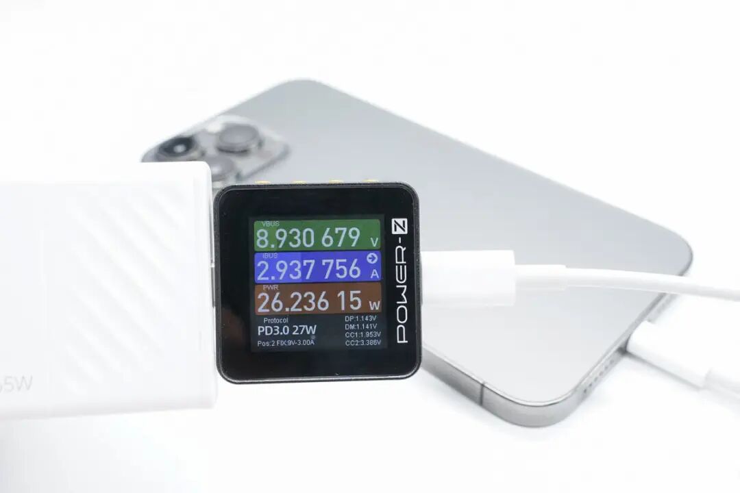 使用这款充电器给苹果iPhone 13 Pro Max充电,通过ChargerLAB POWER-Z KM002C测得充电功率为8.93V 2.94A 26.24W。