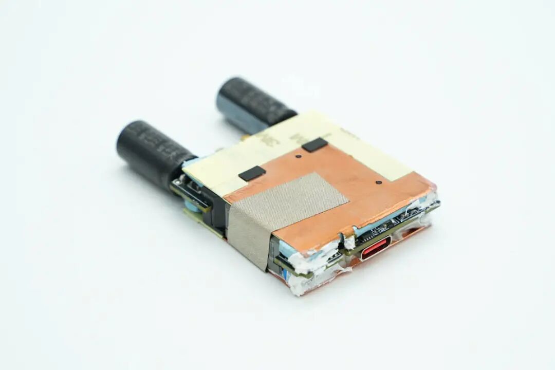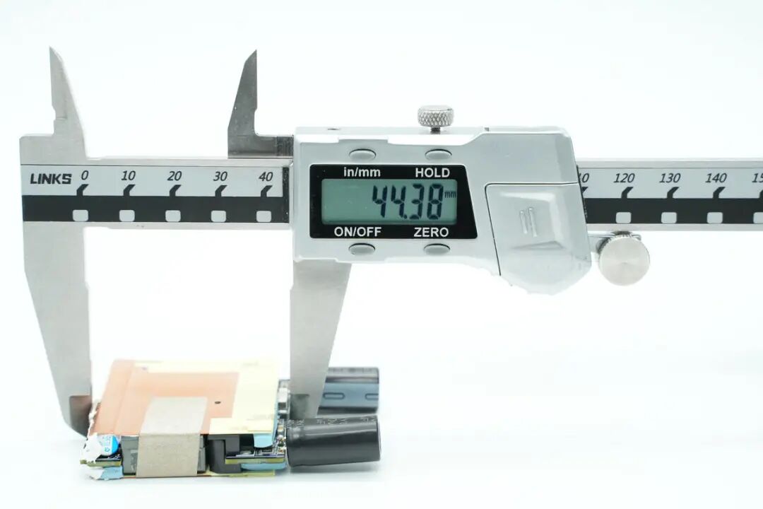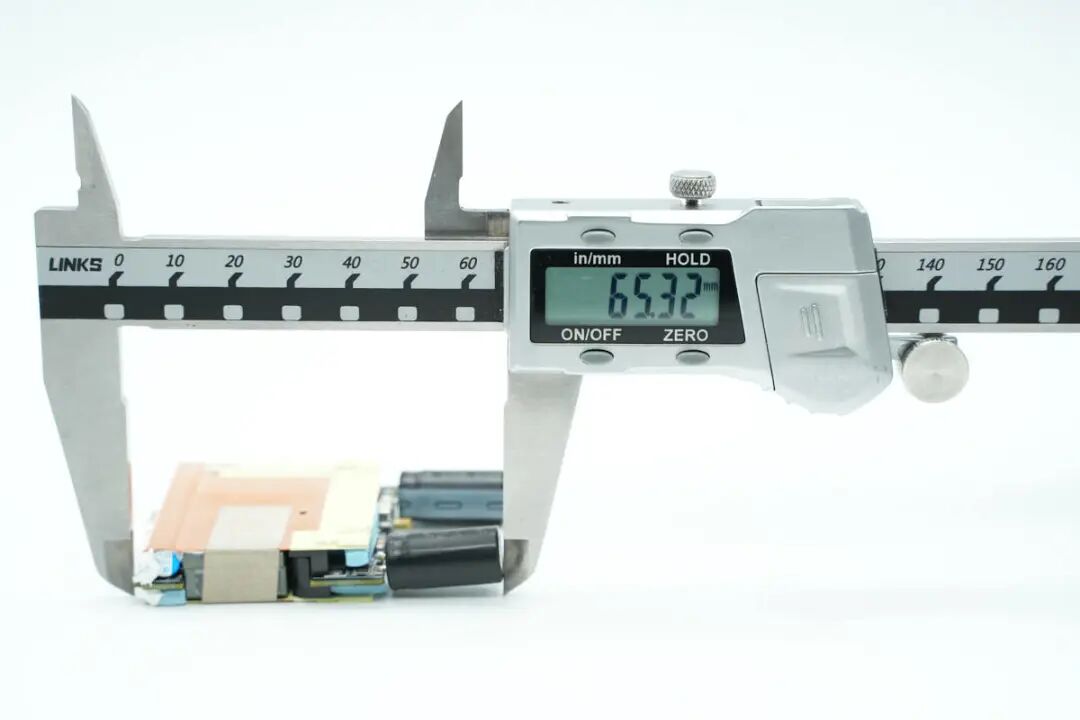 模块正背面均覆盖铜片帮助散热,为了降低整体厚度,两颗高压滤波电解电容放置在折叠插脚两侧的空间内部。