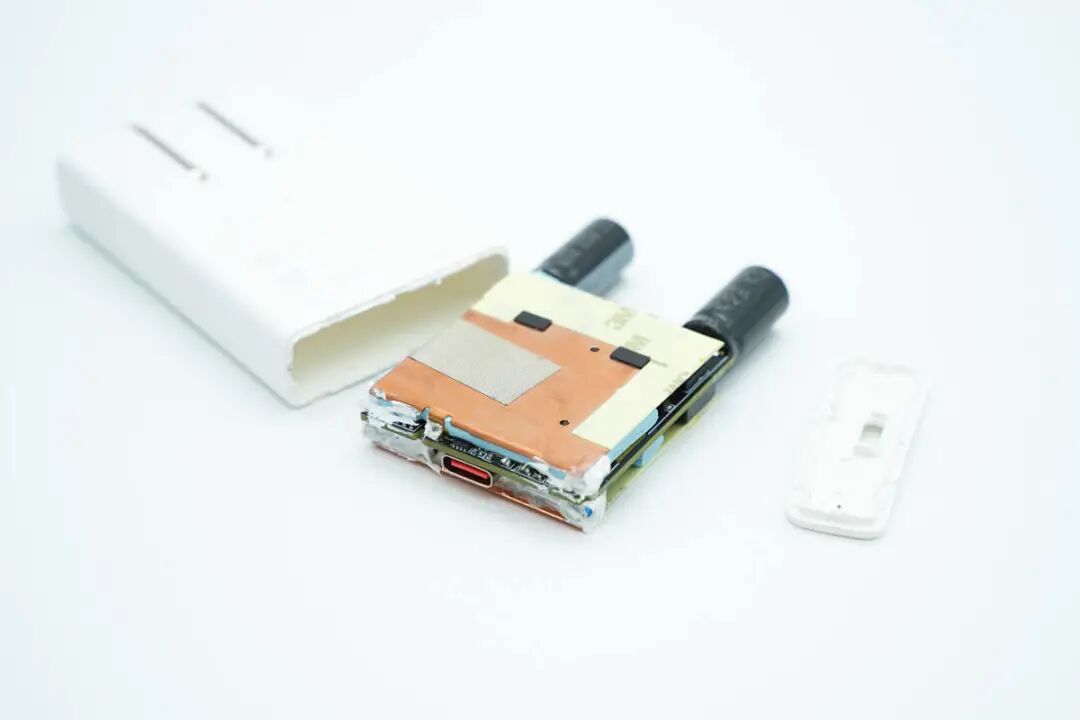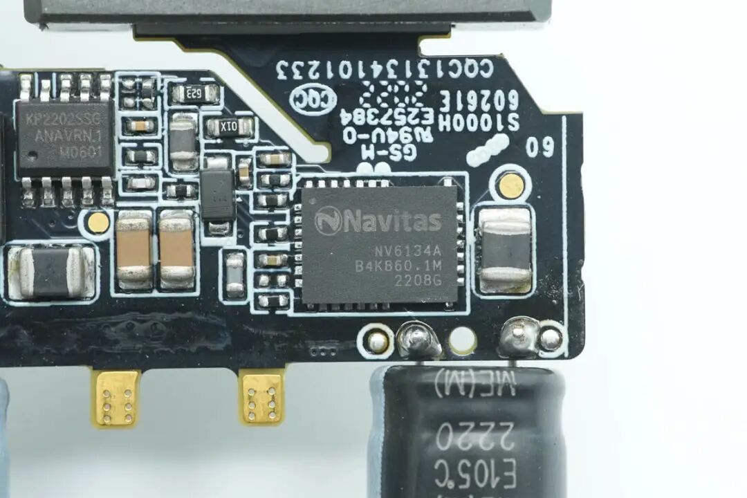 充电头网通过拆解了解到,充电器采用了必易微KP2202SSG和南芯SC3503初次级控制器组合的高频QR电源方案,氮化镓器件采用纳微NV6134A,伟诠协议芯片通过光耦反馈控制输出电压。充电器内部采用了知名品牌绿宝石的电解电容和固态电容进行输入输出滤波,用料均来自知名大厂,扎实可靠。