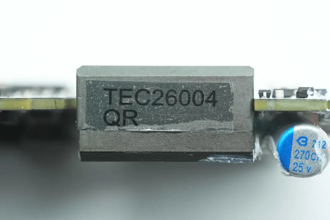 平面变压器由PCB板制成,磁芯侧面贴有标签,印有TEC26004和QR字样。