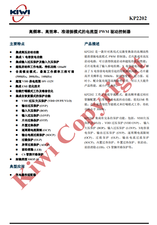 KP2202最高工作频率分500kHz、300kHz、140kHz三档可调;通过峰值电流抖动实现抖频功能;VDD供电范围10-112V;芯片集成完善全面的保护功能,内置驱动器可驱动CoolMos和GaN开关管。
