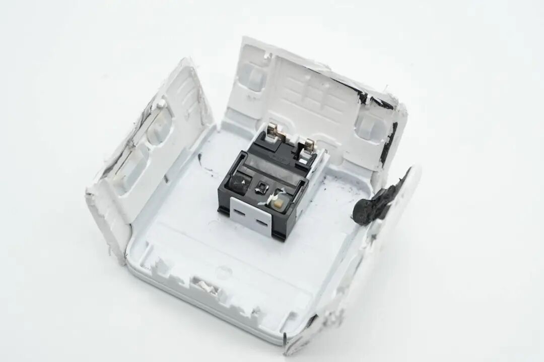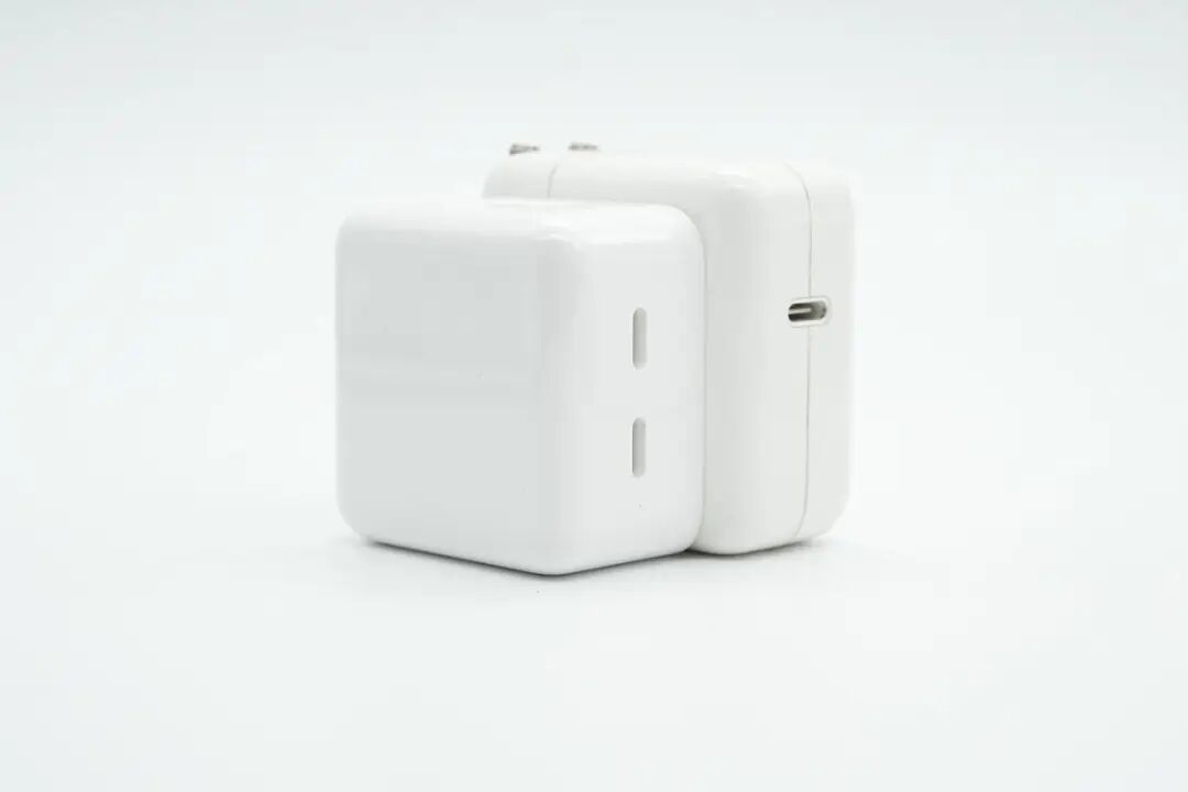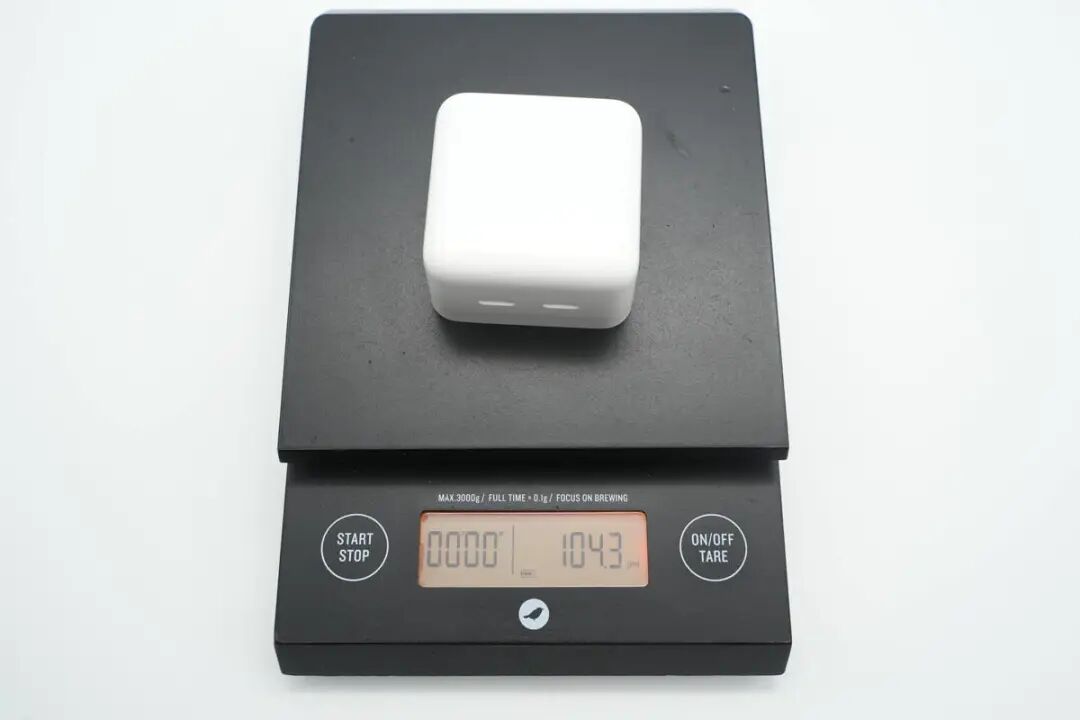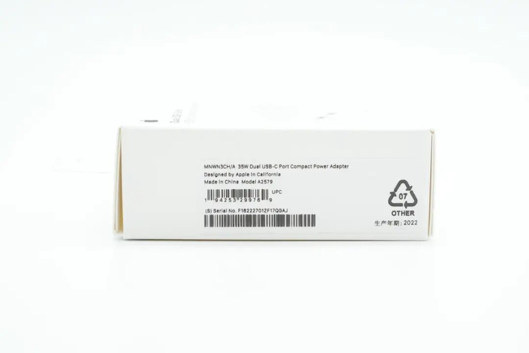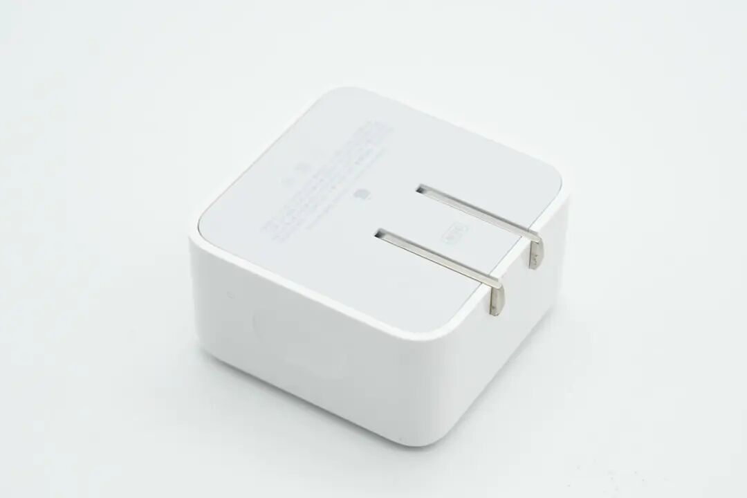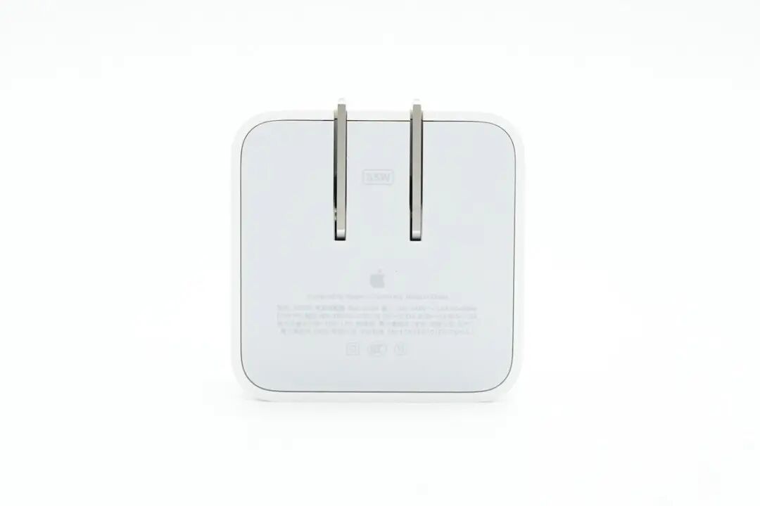 这款35W充电器采用折叠插脚设计,便于携带,具备两个USB-C接口,支持双设备同时充电,可以同时为MacBook和iPhone充电,免去携带多个充电器的麻烦。这是苹果首个双口充电器,单口支持35W功率输出,双口支持功率自动分配。下面我们就对这款充电器进行拆解,看看内部的做工用料如何。包装盒正面印有苹果logo、充电器名称以及外观图。充电器顶面和侧身采用一体式白色外壳,表面高光亮面处理,边角过渡圆润。![]()