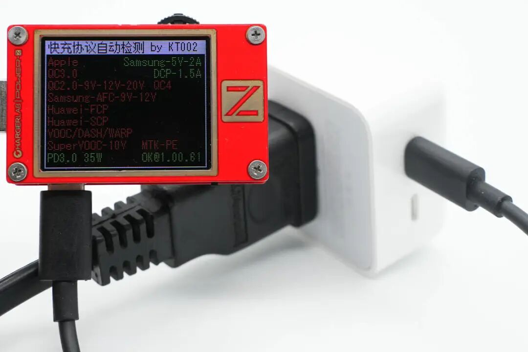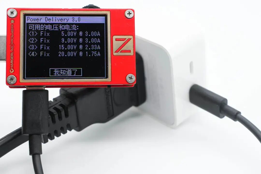 PD输出1或2:5V3A、9V3A、15V2.33A、20V1.75A充电器配备可折叠国标插脚,携带方便且不会刮伤包里其它设备。与苹果30W USB-C充电器对比,整体稍小一些。PDO报文显示C1口具备5V3A、9V3A、15V2.33A、20V1.75A四组固定电压档位。PDO报文也完全一样,两个USB-C接口单口输出性能完全一致。