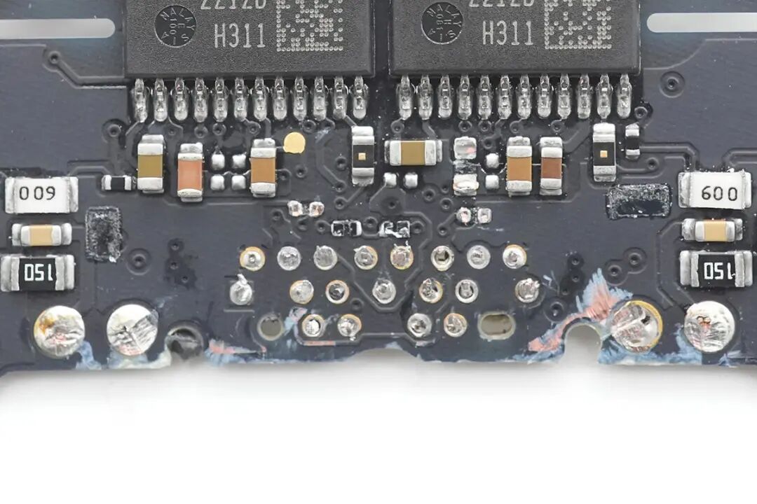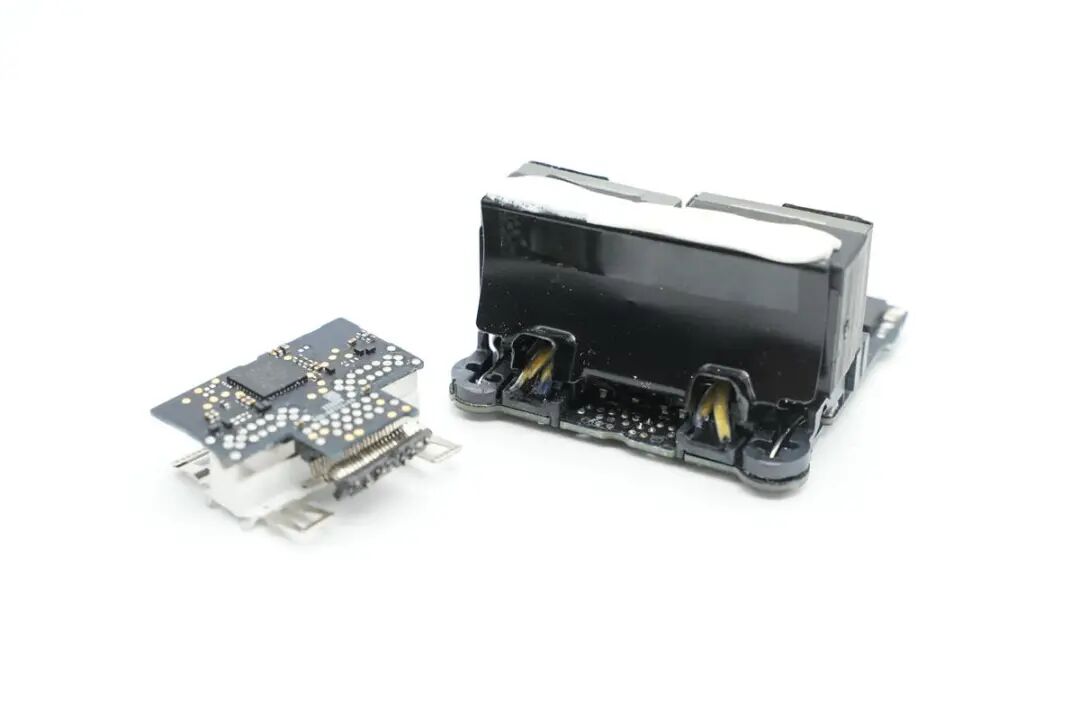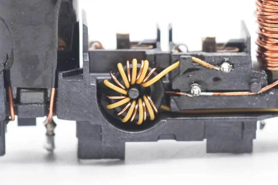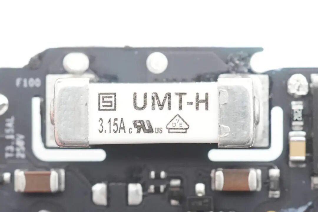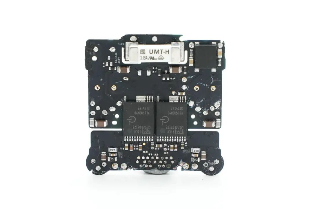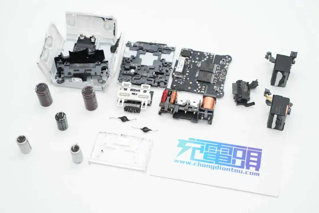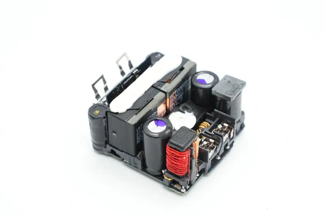 对苹果这款35W充电器的外观、大小、性能等有了基本了解后,下面继续对其进行拆解,看看用料如何。沿外壳边缘切开充电器外壳,取出充电器内部PCBA模块,变压器涂有白色导热胶通过外壳散热。充电器外壳采用卡扣连接,灰色塑料插入到白色塑料壳体内部固定,十分牢固。充电器输入端一览,采用弹片连接供电,两侧焊接高压滤波电容,共模电感和差模电感,对应折叠插脚位置空间凹陷,充分利用内部空间。充电器输出端为变压器和滤波电容,变压器缠绕胶带绝缘,电容包裹热缩管绝缘,输出小板通过排针连接到主板上。PCBA模块正面一览,这款35W双口充电器为双路独立的电源设计,对应两颗独立的变压器和输出滤波电容。PCBA模块背面一览,可以看到同步整流管,VBUS开关管以及初级的元件都是对称的配置。再插入一张将充电器PCBA正面插件元件拆除的图片,结合上下图片可以看出,苹果这款35W充电器采用两路相同的QR开关电源设计,正面焊接两颗PI的主控芯片,搭配协议芯片小板控制输出电压,实现单口输出时两路开关电源并联,共同输出35W功率,双口同时输出时按照负载需求独立输出。下面我们就从输入端开始了解各个元器件的信息。充电器交流输入侧一览,交流输入通过插座焊接连接到PCB上,左侧的共模电感和右侧的差模电感同样为焊接连接。交流输入端采用簧片与充电器插脚相连接,方便使用不同制式的插脚,满足苹果充电器不同国家的销售需求。在塑料外壳下面是一颗共模电感,交流输入直接连接到共模电感,经过共模电感后焊接连接到PCB上。第一级共模电感采用漆包线和绝缘线绕制在黑色磁环上,输出焊接连接到第二颗共模电感。第二颗共模电感采用红色和铜色漆包线在口型磁芯上绕制,中间插入塑料框架绝缘,底部焊接输出接线柱,便于自动化装配。支架内部对应输入保险丝的位置印有SALCOMP,表示由赛尔康代工。交流输入首先经过保险丝进行过流保护,保险丝来自SCHURTER硕特,UMT-H系列延时贴片陶瓷保险丝,额定电流2.5A,分断能力达1500A。整流桥型号为MRS30M,额定电流3A,耐压1000V,是一颗快恢复整流桥,将交流电整流为脉动直流电。充电器初级共使用三颗电解电容滤波,其中两颗规格为400V 22μF,来自AiSHi艾华。另一颗滤波电解电容来自丰宾,规格为10μF 400V,三颗电容配合差模电感,将整流桥输出的脉动直流电滤波成为直流电为初级主控芯片供电。将两颗变压器也焊下,变压器下面是两颗初级主控芯片。对应次级侧元件有绝缘支架固定Y电容和输出滤波电容,支架内部固定两颗黑色Y电容。交流输入经过EMI滤波电路,整流桥整流和高压电解电容滤波后,为两颗初级主控芯片供电。初级主控芯片来自PI,丝印ZN1431C,为苹果定制型号。芯片内部集成初级控制器,高压开关管,同步整流控制器和反馈功能,集成度高,外围器件精简,简化快充电源电路设计。用于反激钳位的RCD吸收电路,吸收变压器初级绕组的漏感能量。两颗变压器由赛尔康代工,两颗变压器为对称设计,充分利用空间。PCBA模块侧面一览,黑色安规Y电容隐藏在变压器底部的支架下面。充电器输出侧特写,两个USB-C母座焊接在单独的一块小板上。焊下USB-C母座小板和输出滤波电容,变压器磁芯对应次级侧还贴有麦拉片绝缘。同步整流管来自AOS万代,型号为AONS62920,是一颗耐压100V的NMOS,导阻6.3mΩ,采用DFN5*6封装。由PI主控芯片输出同步整流信号控制导通,进行同步整流。另一颗为同型号,搭配PI电源芯片进行同步整流,组成两路对称的开关电源设计。两颗固态电容来自丰宾,为PS系列导电聚合物电容,耐热105℃,规格为560μF 25V,用于输出滤波。丝印4C05的MOS管,实际型号为NTTFS4C05N,来自安森美,是一颗耐压30V,导阻2.9mΩ的NMOS,采用WDFN8封装。另外一颗安森美NTTFS4C05N MOS管特写。充电器主板连接输出小板排针的焊盘特写,通过排针连接到USB-C母座小板上。小板背面焊接一颗协议芯片,用于两个接口的协议,控制电源输出电压,USB-C接口连接TVS二极管,用于静电保护,上方焊接排针,连接到充电器主板。小板正面两个USB-C母座为一个整体,通过外壳卡扣固定。上方是连接充电器主板的排针,焊接到主板上取电。协议芯片来自英飞凌,型号CYPD4236-LQXQT,属于EZ-PD CCG4系列,是一款支持双口快充应用的协议芯片,提供两个完整的USB PD接口应用,可用于笔记本,适配器和扩展坞应用。EZ-PD CCG4采用赛普拉斯专有的M0S8技术,内置32位 ARM M0处理器,具有128KB闪存和8KB内存,采用6*6mm 40pin QFN封装。苹果35W双C口充电器与传统的家族式设计不同,和港版折叠插脚的充电器外形设计类似。其内置两个USB-C接口,单口35W输出功率满足MacBook Air 2022充电,同时还可为两台iPhone充电,充分满足苹果用户的快充需求。充电头网通过拆解了解到,苹果35W双C口充电器外壳固定牢固扎实,采用灰色外壳穿插入白色外壳内部,通过卡扣与超声波焊接,充分保证了大面积固定的可靠性。充电器采用插接件供电,满足苹果针对多国插头的设计,只需一款PCBA模块即可满足全球各地电源的生产,而无需重新设计。充电器内部使用两路PI高集成芯片ZN1431C,搭配英飞凌CYPD4236组成两路相同的开关电源,在充电器单口输出时,将内部两路电源输出并联,实现全功率35W输出,双口同时输出时,内部两路电源分别对应两个接口,独立输出。通过内置两路电源的设计,大大提高了充电器的实用性。