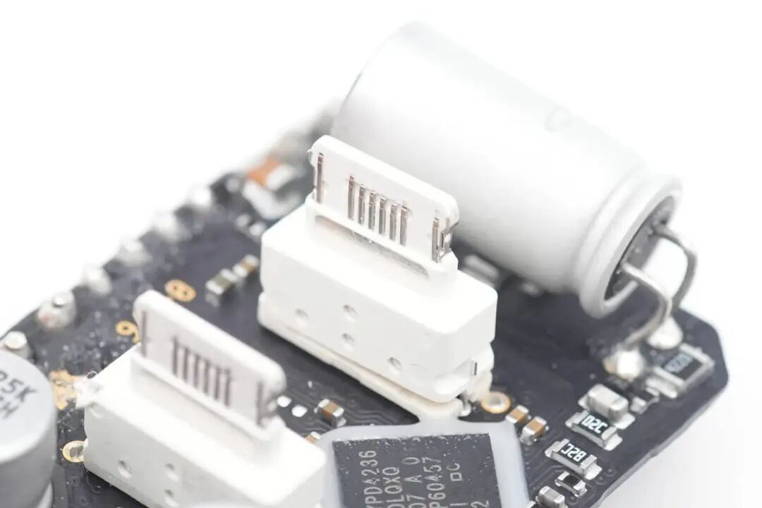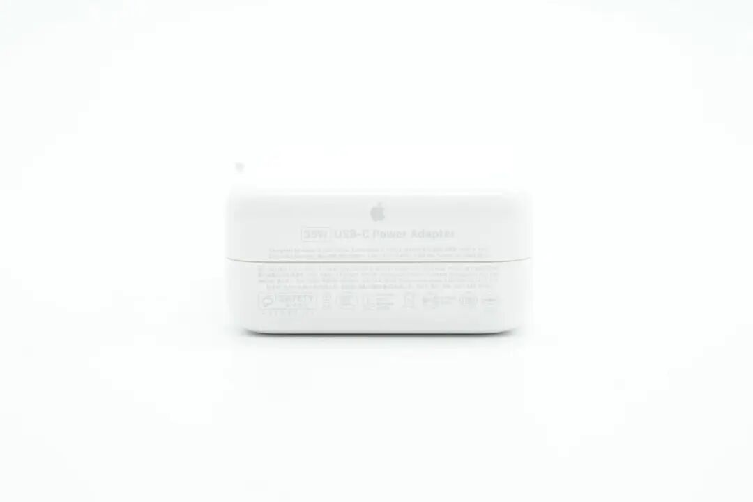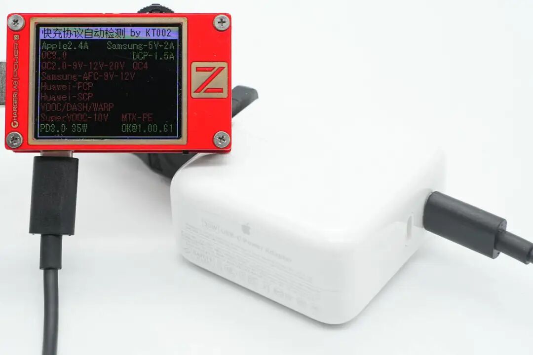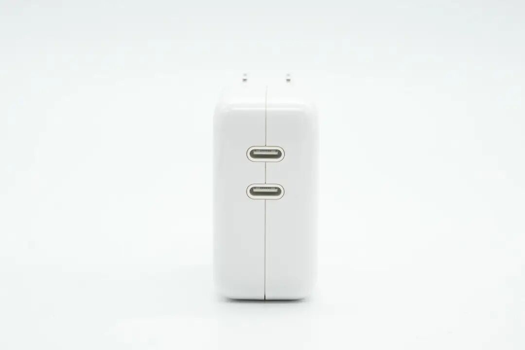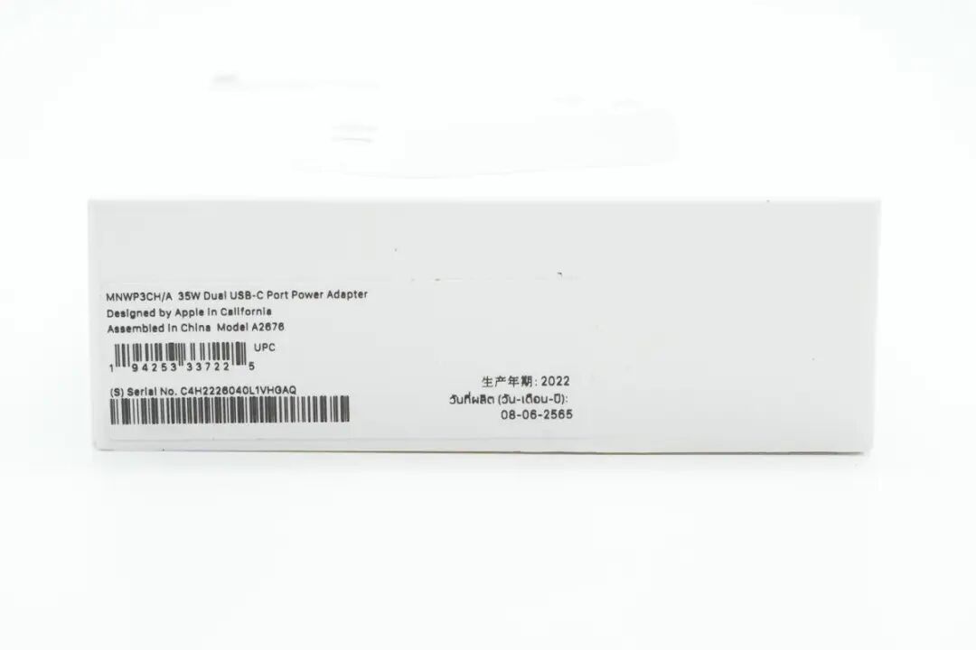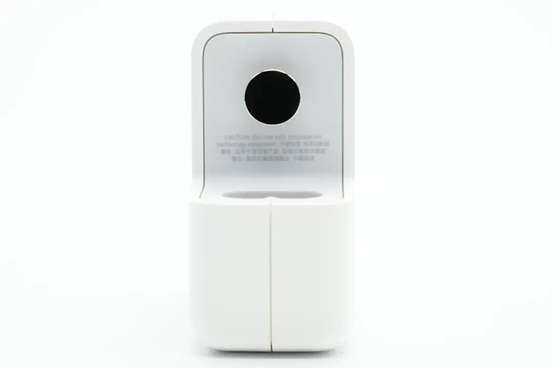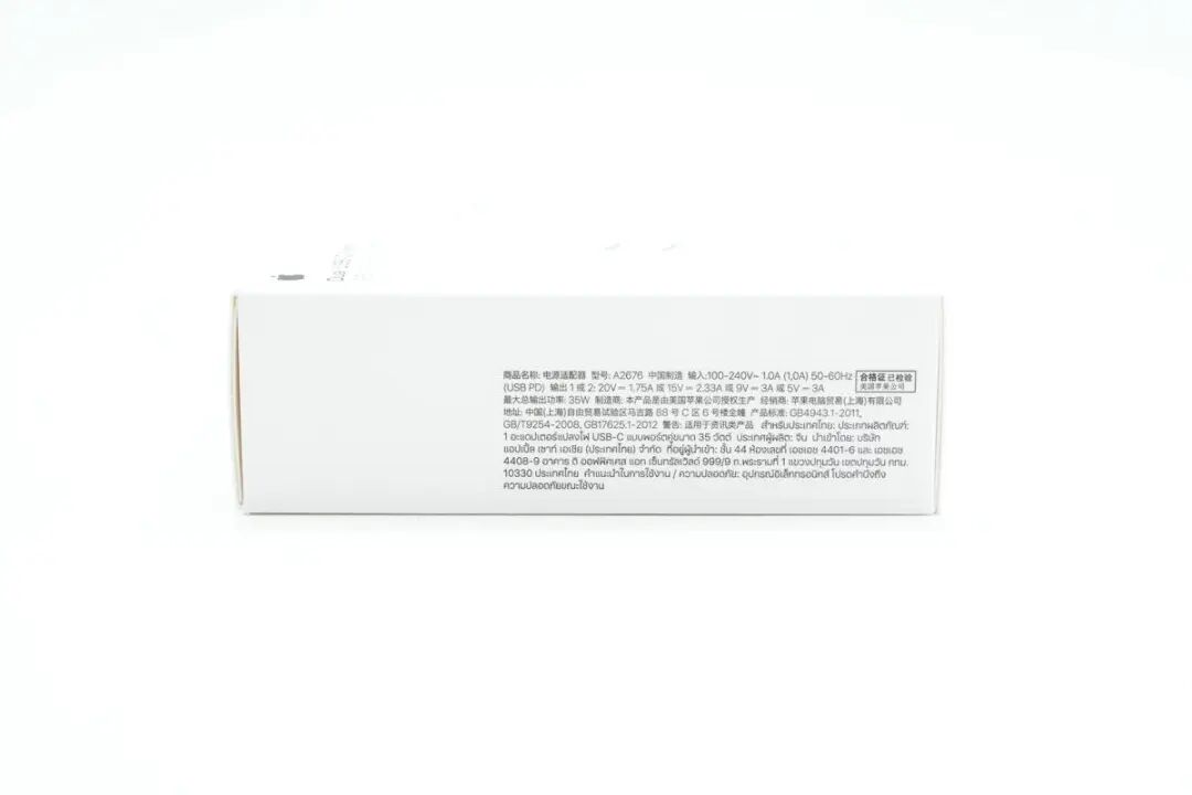 这款充电器采用了苹果充电器的家族设计,使用传统的可替换折叠插脚,也可以搭配延长线使用,无论是在家中还是在外面使用都更加方便,下面就对这款35W双口充电器进行拆解,看看内部是如何设计的。包装盒正面印有苹果logo、充电器名称以及外观图。另一侧贴有产品生产日期贴纸,中国制造,包装盒除了正面充电器外观图,其它设计都和之前拆的A2579的是一样的。苹果A2676充电器采用经典方块造型设计,白色亮面外壳,边角过渡圆润。插脚为可拆卸独立模块设计,两侧加入双翼提升使用稳定性。配备的是可折叠国标插脚,携带方便且不会刮伤包里其它设备。插脚模块拆下,机身上有T字型固定座帮助固定,此外还能起到接地作用(需要更换带接地插脚的电源线)。插脚模块外壳上印有2.5A 250V~规格、Longwell(良维)制造商以及CHN字样。PD输出1或2:5V3A、9V3A、15V2.33A、20V1.75A充电器已经通过了CCC、KC认证,以及VI级能效认证。PDO报文显示C1口具备5V3A、9V3A、15V2.33A、20V1.75A四组固定电压档位。PDO报文也完全一样,两个USB-C接口单口输出性能完全一致。双口同时输出,测得两个接口PDO报文都是5V3A、9V1.94A、15V1.16A、20V0.87A四组固定电压档位。使用苹果MacBook Pro读取得充电器序列号为C4H2237027P1VHGAY。使用这款充电器给苹果MacBook充电,测得充电功率为19.95V 1.68A 33.46W。拿来给苹果iPhone 13 Pro Max充电,测得充电功率为8.94V 2.93A 26.18W。拿来同时充苹果iPhone 13 Pro以及iPhone 13 Pro Max两部手机,测得功率都在16.5W左右,支持功率智能分配。使用充电器同时充苹果手机和耳机,测得耳机充电功率约为1.7W。iPhone 13 Pro Max手机的充电功率约为26.05W。