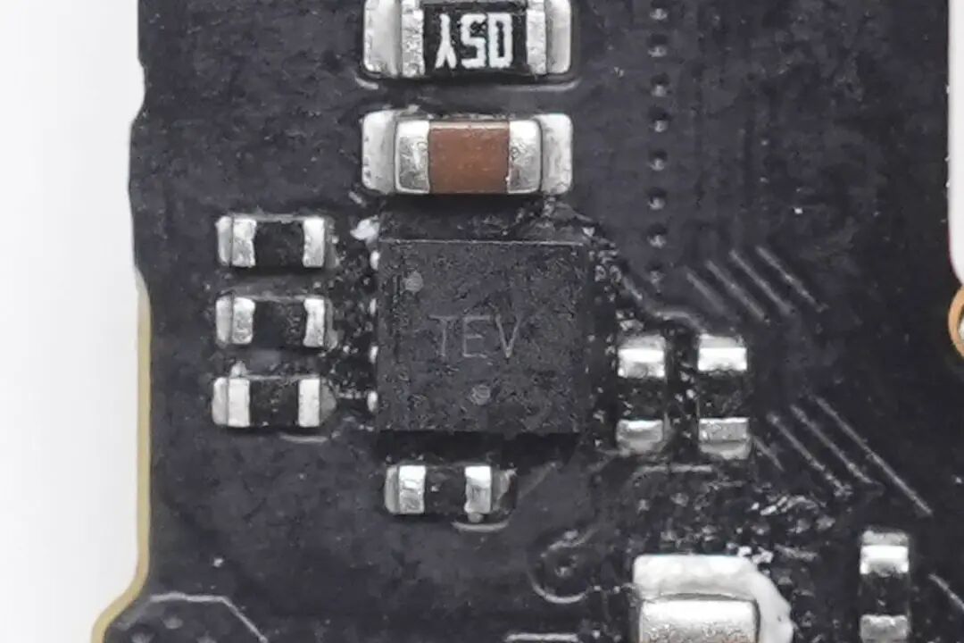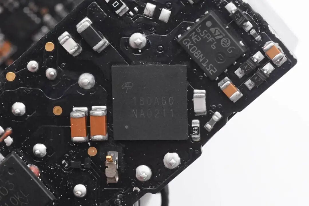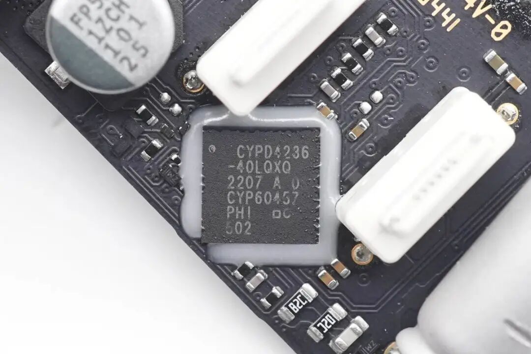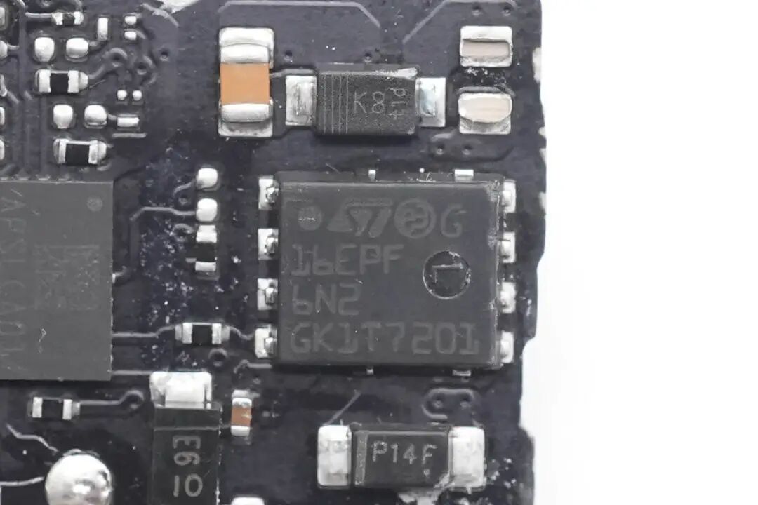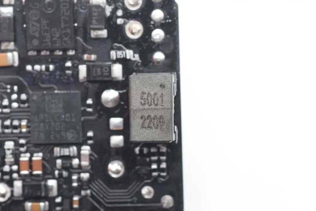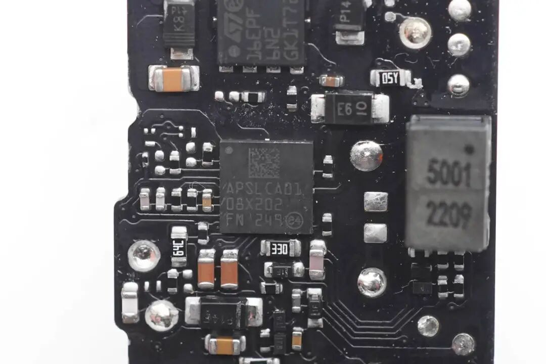 看完这款充电器的开箱和测试后,下面就进行拆解,一起看看内部是如何设计的。充电器内部电容,PCB板均使用导热硅胶罩覆盖,填充内部空间。从外壳内部取出PCBA模块,PCBA模块底部也有契合形状的硅胶垫填充。PCBA模块分为AC电源部分和DC降压部分,其中DC降压模块采用单独的塑料壳绝缘。使用游标卡尺测得PCBA模块长度约为49.19mm。电源输入采用导线冷压端子,外套热缩管保护,焊接连接到PCBA模块上。接地线采用螺丝固定在T型固定端子上,搭配三相延长线使用可以将充电器接地,防止出现麻手的情况。T型固定端子采用螺丝固定接地线,另一端焊接在DC降压模块上。PCBA模块正面一览,苹果这款35W双口充电器采用二次降压的电路设计,变压器输出直接焊接到降压小板上,小板上进行同步整流滤波后为降压电路供电。取下充电器PCBA模块上覆盖的硅胶罩和绝缘罩,进行详细拆解。通过对充电器的观察,苹果这款35W双口充电器采用开关电源搭配两路降压电路的方式,由协议芯片控制降压芯片输出电压,满足双口同时快充输出的设计方式。变压器次级输出直接连接到输出小板上,由小板进行同步整流并降压输出。充电器交流输入端一览,输入端保险丝固定在支架上方,左侧是安规X2电容,右侧是共模电感,立体布置,充分利用内部空间。保险丝使用胶带固定在绝缘支架上,安规X2电容在支架左侧的空间内,右侧是一颗共模电感,使用红色和铜色漆包线绕制在磁环上,并缠绕胶带绝缘。输入端整流桥来自光宝,丝印RTT10KL,将交流电整流成脉动直流电。三颗高压滤波电容来自丰宾,规格为22μF 400V,共计66μF容量。差模电感采用工字磁芯,配合三颗电解电容,将整流桥输出的脉动直流电滤波成为直流电为开关电源供电。电解电容和差模电感采用一个一体式硅胶罩分体绝缘,差模电感没有外套热缩管和缠绕胶带绝缘。拆掉AC电源PCBA模块正面的插件元件,正面焊接一颗主控芯片和一颗开关管。丝印5001的互感器,用于初级电流检测,消除了传统取样电阻带来的功率损耗。初级开关管来自AOS万代,丝印180A60,实际型号为AONV180A60,是一颗耐压700V的NMOS,导阻160mΩ,采用DFN8*8封装。为初级主控芯片供电的电解电容,规格为35V 47μF。紧贴着变压器焊接一块小板用于输出电压反馈。小板下方焊接连接输出小板,背面固定一块绝缘塑料罩。输出降压小板焊接两颗电感和滤波电容,分别对应两路同步降压电路用于降压输出。外壳内部贴有一片铜箔,铜箔通过PCB上粘贴的导电布接地。小板正面焊接两路降压电感,两个USB-C母座以及一颗协议芯片,四颗固态电容用于输入和输出滤波。小板背面左侧焊接同步整流管,中间是两颗VBUS开关管,右侧两颗双MOS管用于同步降压,最右侧两颗为同步降压控制器,由协议芯片控制调节输出电压。同步整流管来自英飞凌,丝印093N15NS,实际型号为BSC093N15NS5,是一颗耐压150V的NMOS,导阻为9.3mΩ,采用SuperSO8封装。滤波电容来自尼吉康,FP系列固态电容,270μF 25V。协议芯片来自英飞凌,型号CYPD4236-LQXQT,属于EZ-PD CCG4系列,是一款支持双口快充应用的协议芯片,提供两个完整的USB PD接口应用,可用于笔记本,适配器和扩展坞应用。EZ-PD CCG4采用赛普拉斯专有的M0S8技术,内置32位 ARM M0处理器,具有128KB闪存和8KB内存,采用6*6mm 40pin QFN封装,焊盘边缘打白色硬胶加固。同步降压控制器来自MPS,型号MP9928,是一颗支持60V输入的电流模式同步降压控制器,内部集成半桥NMOS驱动器,工作频率100kHz-1MHz可编程,支持相位翻转输出,支持逐周期过流保护,具备输出过电压保护功能和高精度过热保护功能。两颗MP9928同步降压控制器分别用于两个接口的降压输出。同步降压开关管来自安森美,型号FDMC007N30D,是一颗双NMOS管,非对称结构,内部为半桥连接,适合于同步降压应用。内部两个MOS管耐压均为30V,降压上管导阻为11.6mΩ,下管导阻为6.4mΩ。用于同步整流输入滤波的固态电容,尼吉康FP5K系列,规格为100μF 25V。两颗输出VBUS开关管来自AOS万代,型号为AON7428,是一颗耐压30V的NMOS,导阻2.3mΩ,采用DFN3.3*3.3封装。输出USB-C母座特写,配合外壳结构组成完整的USB-C母座。苹果新推出的35W双口充电器采用传统的家族式设计,体积与30W充电器相当。充电器单口支持35W功率输出,并且支持功率自动分配,满足手机和笔记本电脑同时充电需求。USB-C口具备5V3A、9V3A、15V2.33A、20V1.75A四组固定电压档位,在接入第二个设备时,先前接入的设备不会断电,改进了用户体验。充电头网通过拆解了解到,这款35W双口内部采用多个塑料件和硅胶罩进行绝缘,在起到绝缘保护的同时,将热量传导至外壳散发,提升充电器的散热性能。充电器内部采用苹果定制APSLC01主控芯片,搭配ST和AOS开关管组成开关电源。变压器输出经过同步整流,由英飞凌CYPD4236控制两路MP9928进行同步整流降压,同步降压管来自安森美,非对称结构更加适合降压应用。充电器初级滤波电容来自丰宾,输出固态电容来自尼吉康,整机用料均为业内一线品牌,充电器的设计和用料都非常给力。2022亚洲户外电源大会