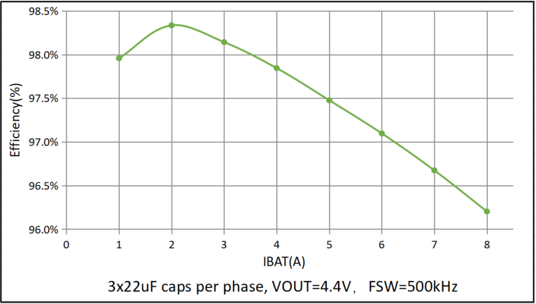上图为SC8546工作在bypass模式下的效率曲线,在单颗输出6A的大功率负载条件下依然保持超过97%的效率指标。