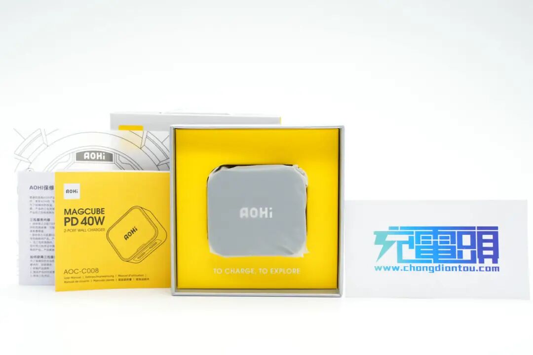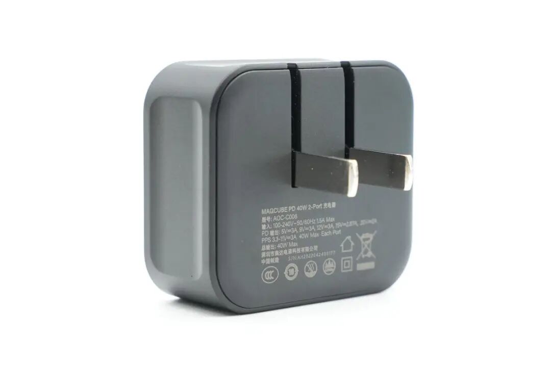 虽然说手机都已支持双卡双待了,但是为了把工作和生活分开,很多人会选择使用两台手机。对应两台手机同时充电就需要两个充电器,不仅不方便携带,还要多占插孔,非常麻烦。同时原装充电器也很少有采用折叠插脚的设计,放在包内还容易划伤其他物品,更加不便。近期Aohi MAGCUBE系列又推出了一款40W双口PD快充充电器,其配备折叠插脚,双口均支持快充,单口支持40W输出和PPS快充,双口支持20+20W功率分配,双口均支持快充,无论是安卓还是苹果手机,都能得到理想的快充效果。下面充电头网就对Aohi这款双口40W充电器进行详细拆解,看看内部是如何设计的。包装盒正面印有Aohi品牌、充电器外观图、名称以及卖点。包装盒天地盖设计,底部印有产品适配设备图以及参数信息,还能了解到充电器有黑、白、灰、红、黄、紫、绿七种丰富配色。包装内含充电器、使用说明书和保修卡,充电器外套防尘塑料袋。充电器造型趋于扁平方块,四端弧面过渡,外壳磨砂抗指纹,整体小巧精致。边缘设有LED指示灯,充电器处于何种状态通过它一目了然,十分方便。机身两侧内凹设计,方便用户插拔使用。配备的是可折叠国标插脚,携带方便且不会刮伤包里其它设备。PD输出:5V3A、9V3A、12V3A、15V2.67A、20V2APPS:3.3-11V3A(40W Max Each Port)机身一侧还配有双USB-C接口,黄色胶芯格外显眼。两个接口均采用银白金属环装饰,让充电器看上去更加精致有档次。厚度为23mm。通过三维算得充电器体积约为49.83cm³,功率密度为0.8W/cm³。和苹果30W充电器对比,接口更多功率更大,体积反倒还要小不少,此外PDO报文显示C口还具备5V3A、9V2.22A、9V3A、12V3A、15V2.67A、20V2A六组固定电压档位,以及3.3-11V3A一组PPS电压档位。两个C口的PDO报文也完全一样,即这两个C口单口输出性能一样,支持功率盲插,日常使然十分方便。