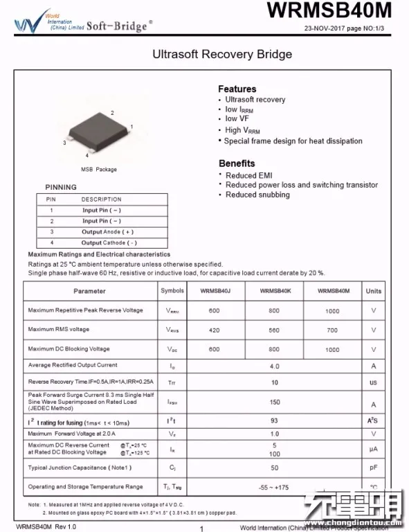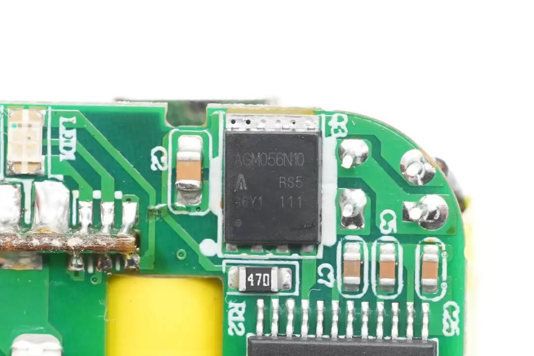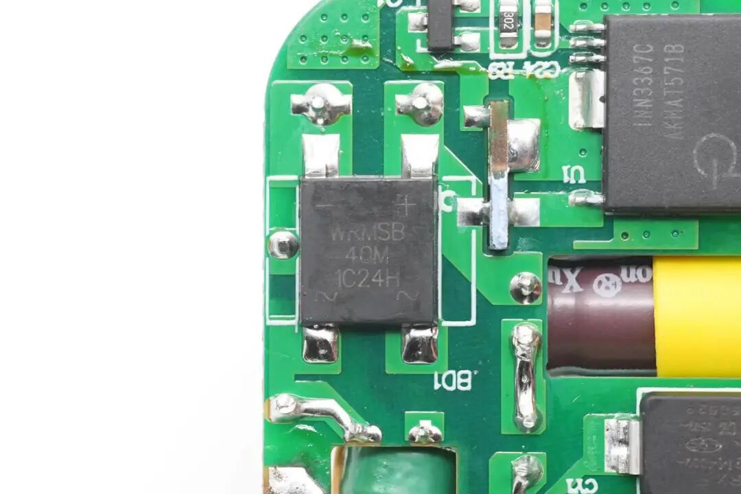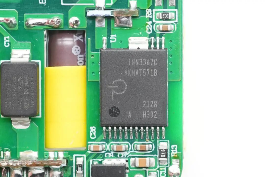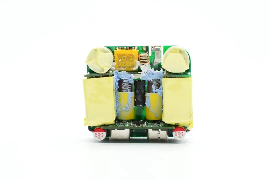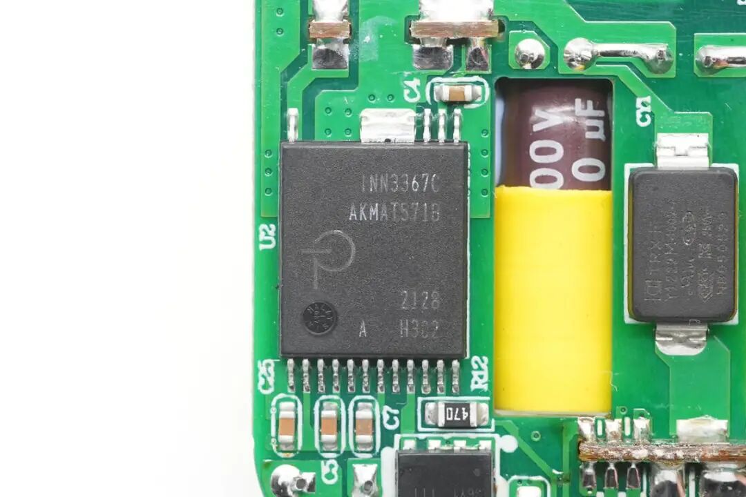 对Aohi这款40W双C口充电器有了基本了解后,下面继续对其进行拆解,看看用料做工如何。首先从充电器插脚侧接缝处拆开充电器,内部电路板为倒装,折叠插脚对应PCBA电解电容,充分利用空间降低整体厚度。取出内部PCBA模块,USB-C接口使用两个金属环装饰保护,不易磨损,更加美观。PCBA模块由三块PCB焊接组成,高压侧小板焊接变压器,初级高压电容缠绕胶带绝缘。PCBA模块正面特写,左上角和右上角两颗高压滤波电容缠绕胶带绝缘,中间两颗滤波电容套有绝缘胶套与次级侧绝缘。PCBA模块背面是两颗PI的高集成电源芯片,由两个独立的电源组成。PCB中间位置镂空放置初级滤波电容,降低整体厚度。通过对充电器模块观察发现,Aohi 40W双口充电器使用两路独立对称的QR开关电源,宽范围输出,输出电压由协议芯片控制,实现两个接口的独立快充。当只连接一个负载时,将两路输出并联,满足大功率输出需求。下面我们就从输入端开始了解各个元器件的信息。PCBA输入端设有延时保险丝,共模电感,安规X2电容以及滤波电解电容。延时贴片保险丝来自于东莞市贝特电子科技股份有限公司,244 2A 250V。安规X2电容容量为0.1μF,与共模电感组成EMI滤波电路。经过EMI电路过滤后,由沃尔德WRMSB40M整流桥将交流电转换为脉动直流电。这颗软桥通过较软的恢复曲线,比较平滑的关断特性,可以降低二极管结电容达到非常少的谐波振荡产生的效果。整流桥输出的脉动直流电通过高压电解电容滤波成直流电为开关电源供电,两颗缠绕胶带绝缘的电容规格为400V 22μF。另外两颗电解电容规格为400V 10μF,滤波电解电容总容量为64μF,电容品牌为XuCon。两颗滤波电容之间是一颗差模电感,使用热缩管包裹绝缘。开关电源主控芯片采用PI INN3367C,为InnoSwitch3-Pro系列,是一颗集成了高压开关、同步整流和FluxLink反馈功能的数控恒压/恒流离线反激式准谐振开关IC,适合应用于高效率USB PD 3.0 + PPS/QC适配器,支持宽电压40W适配器应用,在Aohi这款双口充电器中降额为20W,具有更低的温升。拆焊下连接变压器的PCB,两个变压器均通过小板焊接连接,变压器底部有导热垫,将主控芯片发热通过变压器散发。贴片Y电容来自四川特锐祥科技股份有限公司,具有体积小、重量轻等特色,非常适合应用于氮化镓快充这类高密度电源产品中,料号TMY1102M。特锐祥专注于被动元器件的研发、生产及销售,注册资本1亿元。旗下有自主电容品牌两类:SMD TRX及DIP TY电容器,TRX将致力于陶瓷材料的研究,以拓展更多品类的应用,为客户提供更多的解决方案。同步整流管由PI主控芯片控制,输出同步整流驱动信号。同步整流管来自芯控源,型号为AGM056N10,耐压100V,导阻4.7mΩ,采用DFN5*6封装。另一路同步整流管同样来自芯控源,型号为AGM056N10。输出滤波固态电容规格为470μF 25V,两路电容也是完全相同的。焊接取下输出小板,小板正面焊接四颗VBUS开关管和两个USB-C输出母座。USB-C接口VBUS开关管来自芯控源,型号为AGM306,NMOS,耐压30V,导阻5.8mΩ,采用DFN3*3封装。左侧一颗用于单口输出时两个接口并联输出,右侧一颗用于接口VBUS开关管。另外一个接口也是相同的配置,使用两颗开关管进行并联和独立输出控制。小板背面是英集芯IP2738双口协议芯片和电流检测电阻。协议芯片采用英集芯IP2738,两个接口输出均由其控制。IP2738是一颗双路协议芯片,支持双口18-140W快充应用,具备独立的反馈控制,具备独立的USB PD控制,相当于两颗IP2736整合到一颗芯片内部,快充规格与IP2736相同。支持USB PD3.1 28V EPR档位,并支持PD3.0/PPS等丰富全面的快充协议,兼容性非常好。主板背面对应外壳的位置焊接一颗RGB LED,由IP2738协议芯片根据输出状态控制颜色,用于指示充电器的负载状态。这也是Aohi MAGCUBE充电器独有的设计,通过灯光颜色即可方便了解充电状态。Aohi 40W双口充电器可以称得上小巧玲珑,搭配折叠插脚仅23mm的厚度非常易于携带,消除了折叠插脚携带不便以及两个充电器使用繁琐的问题。充电器支持5V3A、9V3A、12V3A、15V2.67A、20V2A五组固定电压档位以及一组3.3-11V3A PPS输出,对于主流的手机快充,都有很好的兼容性。充电头网通过拆解了解到,Aohi双口40W充电器内部使用两组相同的开关电源配合英集芯IP2738双路协议芯片组成。开关电源主控采用PI INN3367C,单颗支持40W输出,降额到20W使用温升更低。两组开关电源由IP2738协议芯片控制,单口输出时两路并联提供更大功率,双口输出时每个接口都支持快充,达到理想的快充效果。