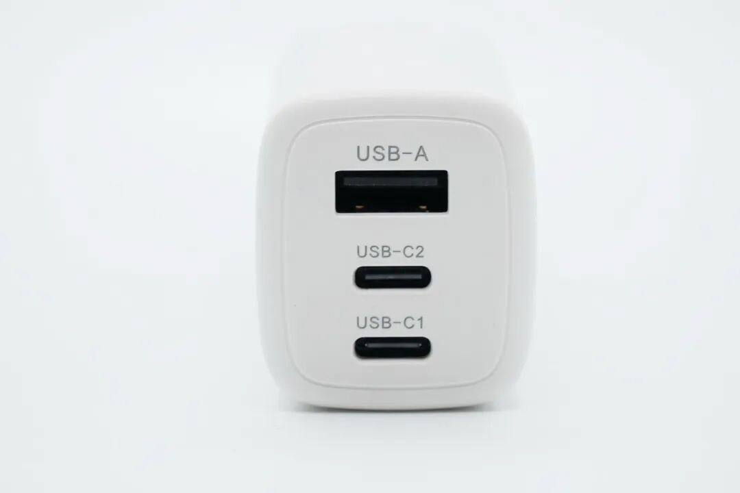 两个 USB-C 支持功率盲插,单独使用均支持 65W 快充输出,USB-A支持 60W 多协议快充输出,功率分配策略合理。采用条形柱状外观设计,功率密度高,配备折叠插脚结构并支持全球电压,小巧便携、支持多设备、大功率输出。