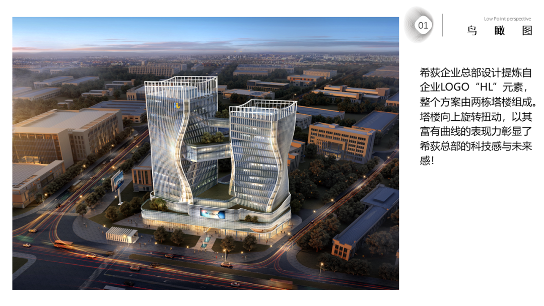 希荻微企业总部设计提炼自企业Logo“HL”元素,整个方案有两栋塔楼组成,塔楼向上旋转扭动,以其富有曲线的表现力彰显了希荻微总部的科技感和未来感。