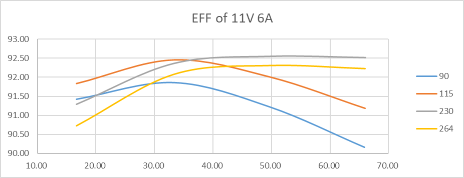 效率测试方面,PI 66W Demo 在11V 6A输出条件下,输入115V和230V时效率峰值均达92.5%;输入264V时效率峰值超92%;输入90V时效率峰值超91.5%。