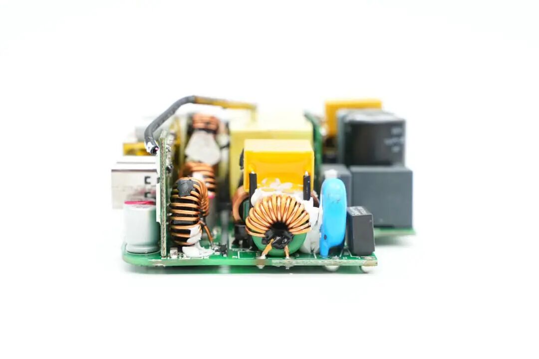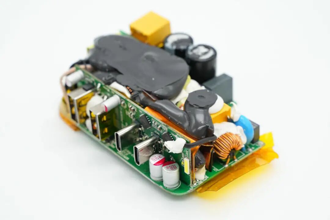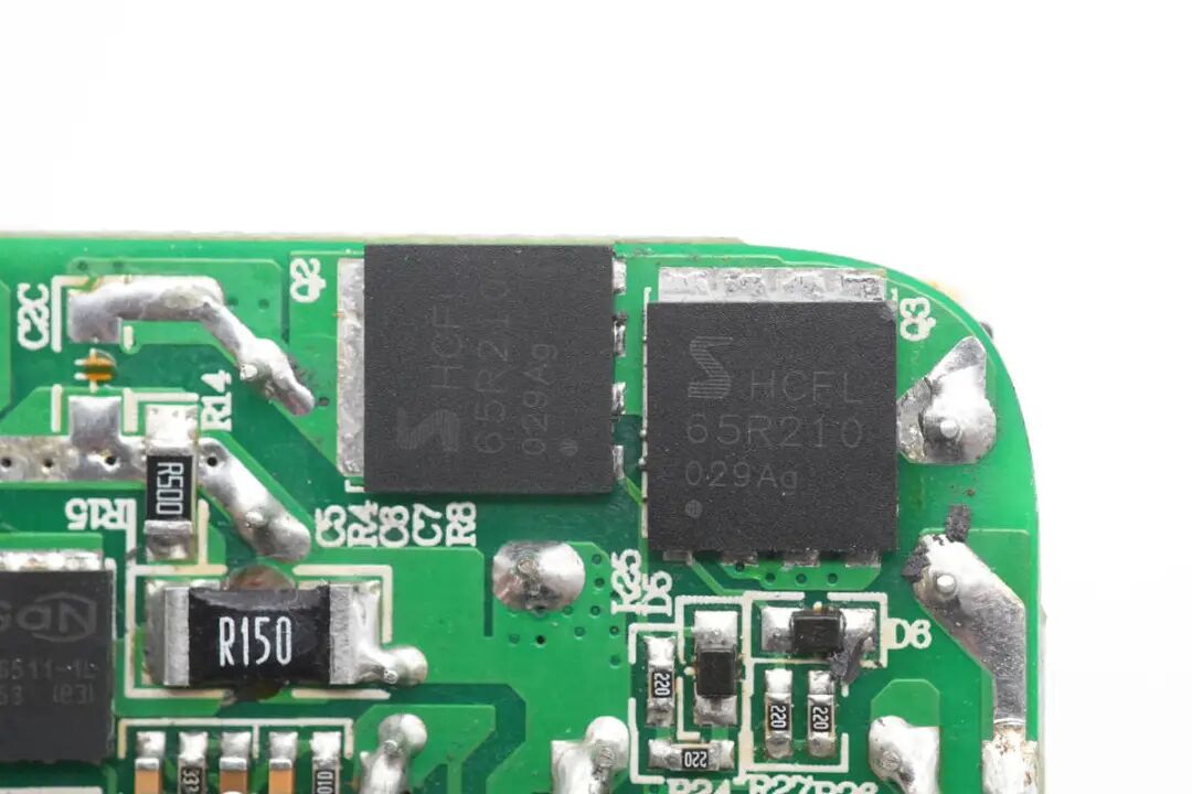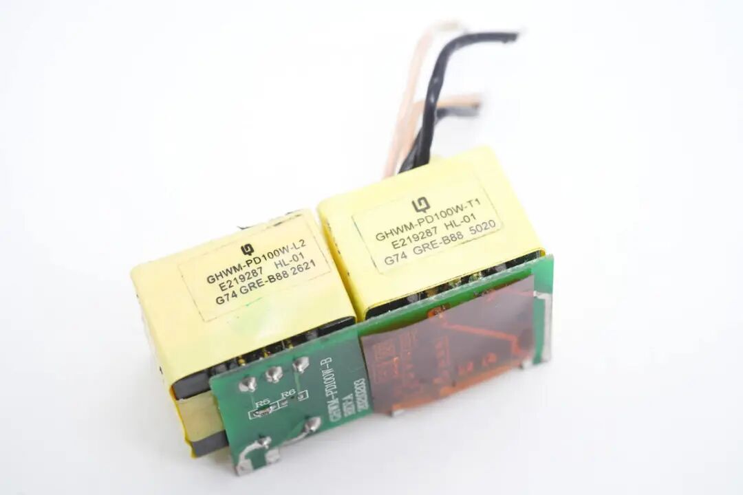 包装盒正面贴纸印有InfinityLAB品牌、充电器外观图、名称以及插脚标识。插脚一侧中心区域为黄色外壳,并印有InfinityLAB品牌logo。充电器正背面外壳以及侧身外壳均为灰色,一浅一淡,表面磨砂抗指纹。USB-C1/C2输出:5V3A、9V3A、12V3A、15V3A、20V5A充电器已经通过了EAC、UKCA、TUV、CE认证,以及VI级能效认证。输出端设有2A2C四个USB接口已经LED指示灯。测得另一个USB-A口也只支持Apple2.4A协议。并且具备5V3A、9V3A、12V3A、15V3A、20V5A五组固定电压档位。测得另一个USB-C口也只支持PD3.0快充协议。PDO报文相同,两个C口支持功率盲插,日常使用方便看完了这款充电器的开箱和性能测试后,下面就进行拆解,看看内部设计和用料如何。撬开超声波焊接的盖子,铝制散热片下面覆盖绝缘麦拉片,用于为PCBA模块散热。充电器内部变压器,电解电容等元件涂有导热胶通过外壳内部的散热片散热。电源输入插座为独立的模块,通过导线焊接,外套热缩管绝缘。拆下PCBA模块,PCBA模块边缘包裹高温胶带绝缘。使用游标卡尺测得PCBA模块长度约为79.9mm。PCBA模块由输出小板和主板焊接组成,输出小板焊接输出母座和二次降压电路。PCBA模块正面一览,其中右侧为二次降压电路,左侧为高压滤波电容,LLC谐振电感和谐振电容,正中为PFC升压电感,底部为LLC变压器。PCBA模块背面顶部焊接两颗整流桥,左侧上方是两颗同步降压转换器,左下角是两颗同步整流管。右侧为PFC升压控制器,升压开关管和整流管,LLC控制器和开关管。低压与高压元件之间开槽插入麦拉片绝缘。通过对充电器PCBA模块的观察发现,这款100W充电器采用PFC+LLC开关电源架构,同步整流,固定电压输出,两个USB-C接口使用独立的降压电路由协议芯片控制输出,两个USB-A口使用一路降压电路,固定5V输出。下面我们就从输入端开始了解整个充电器的设计和用料。充电器输入端特写,焊接保险丝,压敏电阻,共模电感,X2安规电容等元件。蓝色压敏电阻来自STE松田电子,规格为10D511K,用于输入过压保护。两颗整流桥来自PY平伟,型号为TBMR610,两颗采用半桥连接,并联使用均摊发热,降低温升。整流输出通过两颗薄膜电容和磁环电感组成的滤波电路为PFC电路供电,两颗薄膜电容均为0.47μF 450V。PFC控制器采用NXP恩智浦TEA19162,用于将整流后的电压升压,进行主动功率因数校正,内部集成X电容放电元件,无需外部元件,集成软启动和关断,支持高精度稳压升压,并且内置多重完善的保护功能。PFC开关管来自GaN Systems,丝印GS6511-1L,实际型号为GS-065-011-1-L,是一颗耐压650V,瞬态耐压为850V的增强型氮化镓开关管,导阻为150mΩ,采用PDFN5*6封装,支持1MHz以上的超高开关频率。器件在设计时简化了驱动要求,栅极驱动电压为0-6V,瞬态耐压为-20至+10V,具有更强的可靠性。器件具备开尔文源极,可用于优化栅极驱动。