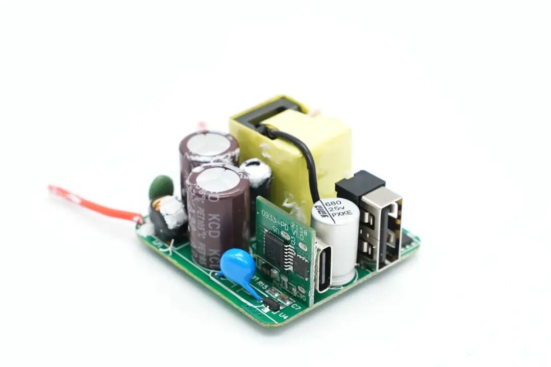 输出端垂直焊接一块小板,小板上焊接USB-C母座,USB-A母座焊接在主板上,中间是一颗用于滤波的固态电容。