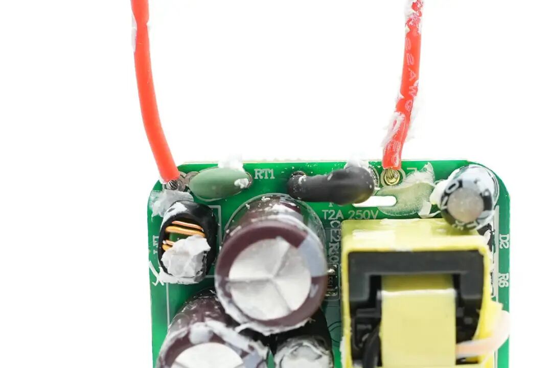 充电器输入端焊接保险丝,NTC浪涌抑制电阻和共模电感,其中保险丝和共模电感外套热缩管绝缘。