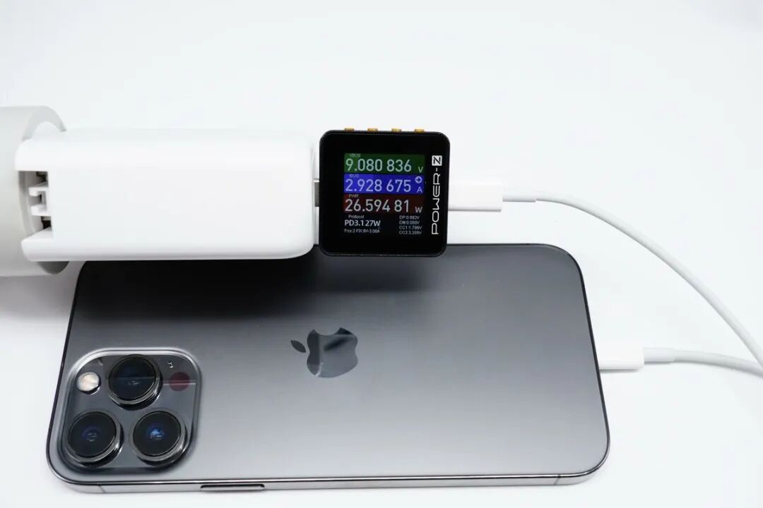 这里简单测试一下 PD3.1 接口的实际充电表现,详细的兼容性测试可以查阅后续评测稿件。对 iPhone 13 Pro Max 充电,充电瞬间即正确握手 9V PDO,功率 9.08V 2.92A 26.59W,达到设备快充功率最大值。