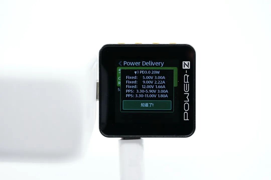 使用 POWER-Z KM002C USB 测试仪读取 USB-C1 PDO 报文,支持 5V3A / 9V2.22A / 12V1.66A 三个固定电压档,另外还带有 3.3-5.9V3A / 3.3-11V1.8A 两组 PPS 电压子集。