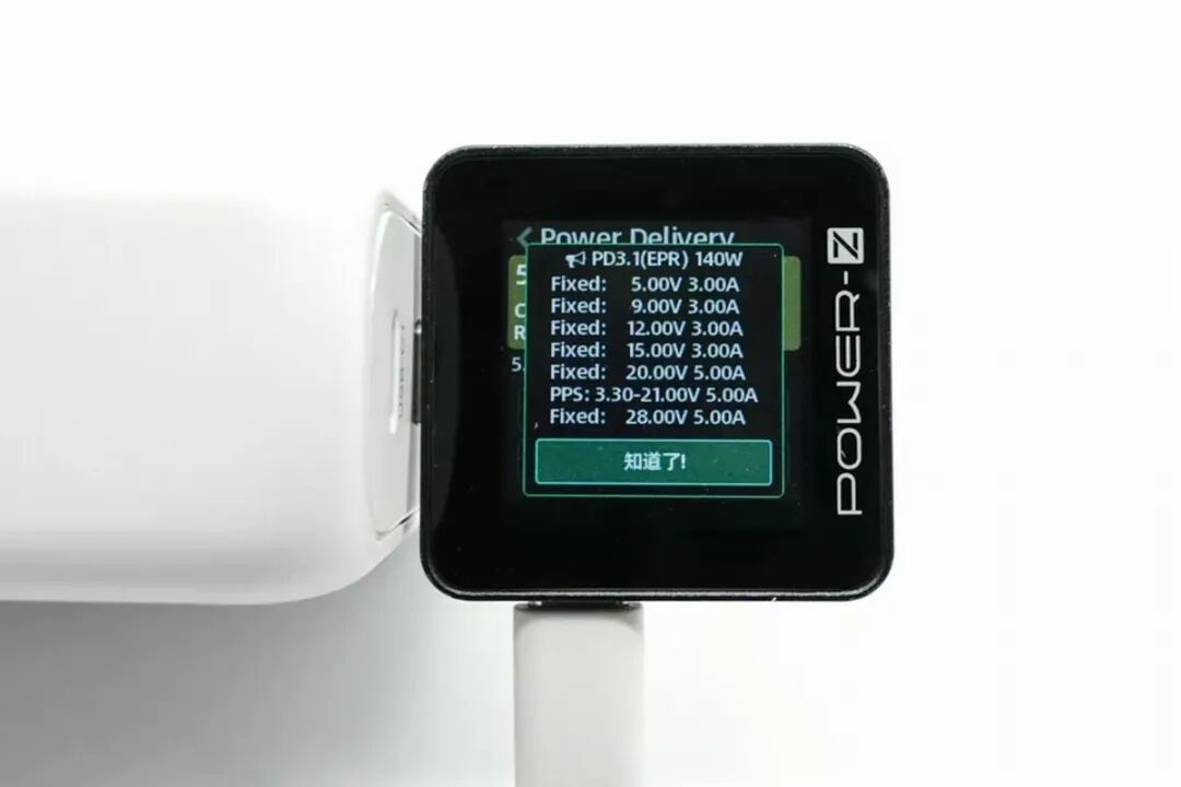使用 POWER-Z KM002C USB 测试仪读取 USB-C2 PDO 报文,支持5V3A / 9V3A / 12V3A / 15V3A / 20V5A 五个 PD3.0 电压档,另外还带有 3.3-21V 5A 一组宽幅 PPS 电压子集。除 PD3.0外,还带有 28V5A 这个 PD3.1 新标准的电压规格,最大输出功率高达 140W。