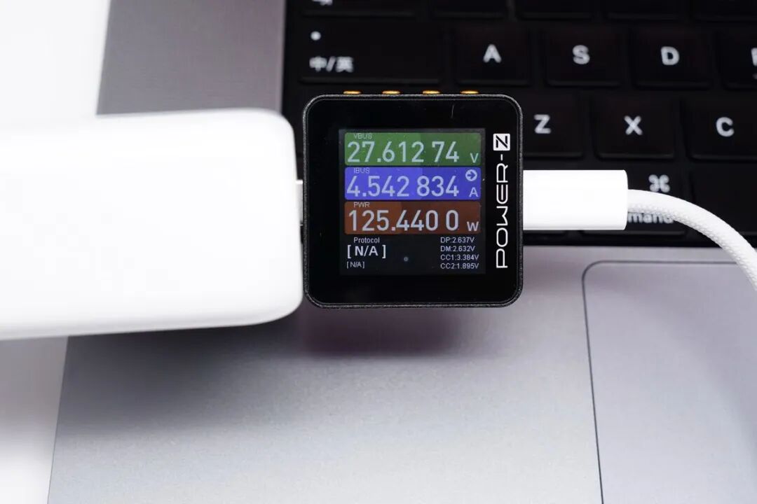 MacBook Pr 16 2021 支持新一代 USB PD3.1 快速充电标准,实测充电瞬间即握手 PD3.1 快速充电协议,正确握手 28V PDO,功率 27.61V 4.54A 125.44W,达到设备快充功率最大值。