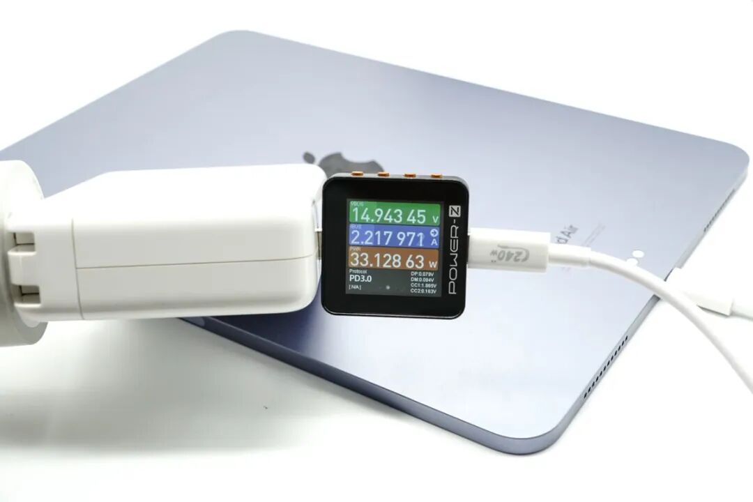 对 iPad Air 5充电,功率达到 14.94V 2.21A 33.12W,达到设备快充功率最大值。