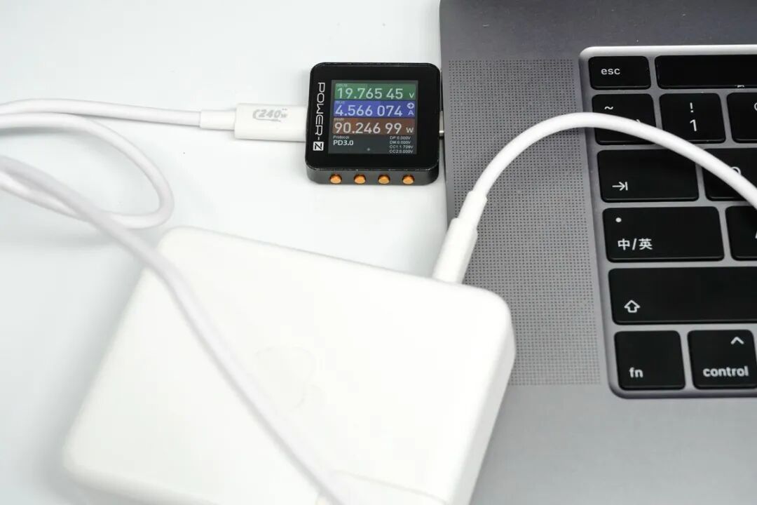 苹果 140W 充电器使用 SAN LIN 240W 数据线对 Macbook Pro 16 2021 充电,因笔记本 USB-C 接口仅支持 PD3.0 充电规格,线缆线下兼容运行在 PD3.0 标准下,充电功率达到 19.76V 4.56A 90.24W,达到设备快充功率最大值。