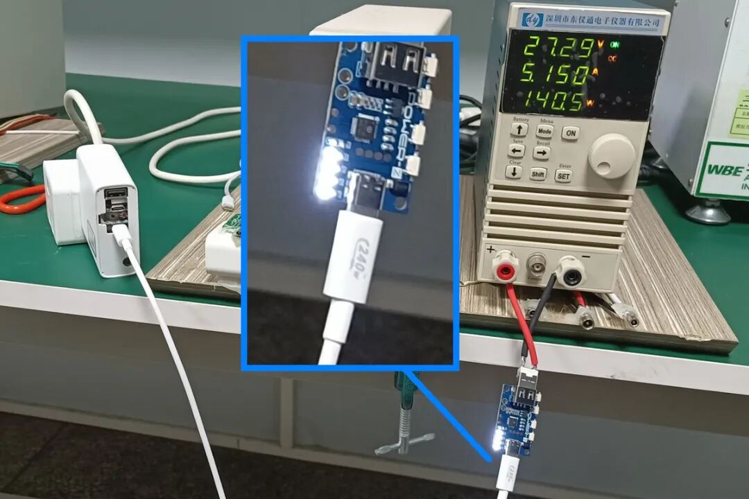 使用 SAN LIN 240W 数据线连接 140W 充电器,再通过诱骗器诱骗 28V5A PDO,实测功率可达到 27.29V 5.15A 140.5W,达到充电器输出功率最大值,成功握手 PD3.1 28V5A 并可以拉满至 140W。