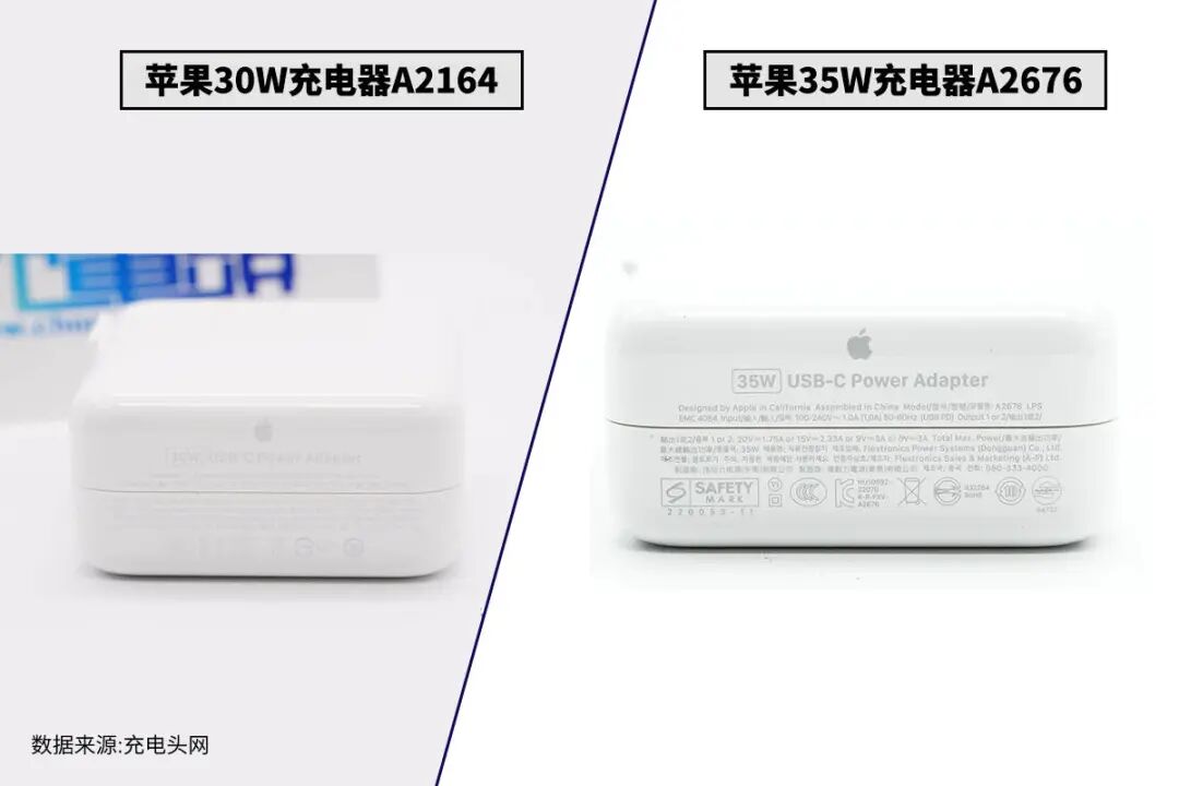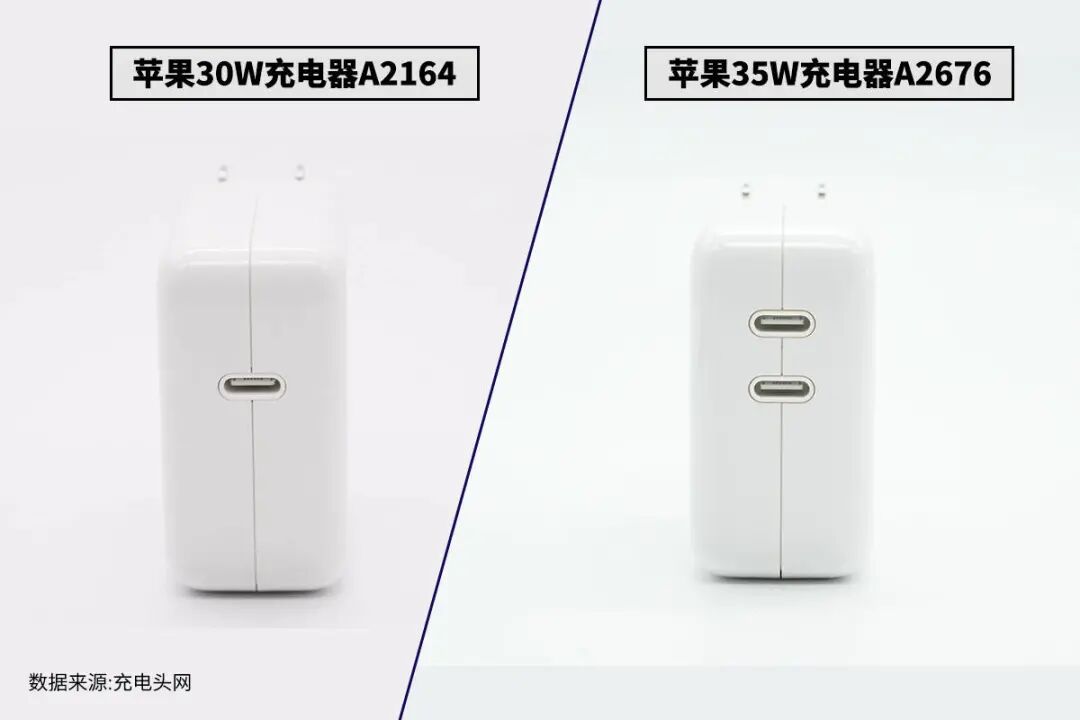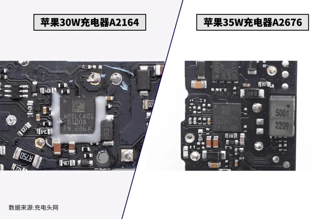 苹果在今年带来了两款全新的双口充电器,也许是对应M2芯片的推出,充电器的接口也要两个。其中一款充电器采用了全新的外观设计,另一款则是传统30W充电器的造型,增加了5W输出功率,同时还增添了一个输出接口,可以为两台设备同时充电,更加实用。充电头网对30W和35W两款充电器都进行了详细拆解,下面通过一篇对比文章,展示充电器内部的不同点,在选购的时候也能多一个参考。苹果30W和35W充电器都是经典包装风格设计,印有苹果logo、产品名称以及外观图。苹果30W和35W充电器都是经典方块造型设计,亮面外壳边角过渡圆润,也是配备折叠插脚,不过是经典可拆卸独立模块设计,为了提升稳定性两侧加入双翼。测得苹果30W充电器三维为28.55*55.87*55.89mm,功率密度约为0.34W/cm³;测得苹果35W充电器三维为28.59*56.06*56.01mm,功率密度约为0.39W/cm³。通过数据对比我们也可以发现,两款充电器大小相当。苹果A2579和A2676两款充电器均配备双USB-C接口,但仔细观察可以发现接口是不一样的,A2676充电器的USB-C母座自带独立外壳,这也是苹果经典充电器的一大特色。苹果30W和35W充电器铭牌均印在机身侧面,都是由伟创力电源(东莞)有限公司代工。输入:100V-240V~50/60Hz 0.75A输出(USB PD):20V/1.5A、15V/2A、9V/3A、5V/3A产品已经通过3C认证、KC认证、CE认证以及VI级能效认证。PD输出1或2:5V3A、9V3A、15V2.33A、20V1.75A充电器已经通过了CCC、KC认证,以及VI级能效认证。苹果30W充电器净重约为99g,A2676充电器净重约为116g。两款充电器的PCBA板型大致相同,但是从形状上看,两款充电器内置的PCBA板朝向不同,插脚侧的空间依旧得到了充分利用,两款充电器内部均采用了塑料支架或橡胶套的设计,支撑固定内部器件,填充空隙。由于苹果A2676充电器为单独的降压小板设计,背面布局相比30W的A2164充电器精简很多,其中A2164充电器背面焊接协议芯片,A2676充电器PCBA背面均为初级开关电源器件。两款充电器的初级主控芯片型号均为APSLCA01,为苹果定制芯片。苹果30W充电器同步整流控制器来自安森美,型号为FAN6240,苹果35W充电器的同步整流控制器丝印TEV。苹果30W充电器协议芯片采用英飞凌CCG3系列,型号为CYPDC1185B2。苹果35W充电器协议芯片为英飞凌CCG4系列,型号为CYPD4236-LQXQT,支持双USB-C口输出应用。苹果30W充电器内置两颗开关管,其中一颗丝印65PF6N2,来自意法半导体,另外一颗开关管来自英飞凌,型号IPL65R650C6S。苹果35W充电器高压开关管采用AOS AONV180A60,是一颗耐压700V的NMOS,导阻160mΩ,采用DFN8*8封装。苹果30W充电器同步整流管丝印S10L,来自安森美,苹果35W充电器同步整流管来自英飞凌,型号为BSC093N15NS5,是一颗耐压150V的NMOS,导阻为9.3mΩ,采用SuperSO8封装。苹果30W A2164充电器内部采用两颗电解电容滤波,规格分别为400V15μF和400V39μF。苹果A2676充电器采用三颗CapXon丰宾电解电容滤波,规格都是22μF 400V。苹果A2164充电器输出滤波电容使用两颗电容滤波,分别为一颗220μF 25V固态电容和一颗25V 470μF电解电容,苹果A2676充电器采用尼吉康FP系列固态电容进行输出滤波,270μF 25V。苹果A2676充电器相较A2164充电器的另一大不同点就是输出端设有两路同步降压电路,同步降压控制器采用MPS MP9928,是一颗支持60V输入的电流模式同步降压控制器,内部集成半桥NMOS驱动器,工作频率100kHz-1MHz可编程,支持相位翻转输出,支持逐周期过流保护,具备输出过电压保护功能和高精度过热保护功能。苹果A2676充电器同步降压开关管采用安森美FDMC007N30D,是一颗双NMOS管,非对称结构,内部为半桥连接,适合于同步降压应用。内部两个MOS管耐压均为30V,降压上管导阻为11.6mΩ,下管导阻为6.4mΩ。测得苹果30W充电器具备5V3A、9V3A、15V2A、20V1.5A四组固定电压档位;苹果35W充电器具备5V3A、9V3A、15V2.33A、20V1.75A四组固定电压档位。最后附上苹果这两款充电器对比表格,方便大家对比两款产品之间的区别。苹果A2164和A2676两款充电器从型号数字上看,两款充电器年份相差较大,内部的器件也有很大变化。这两款充电器外观几乎完全相同,不同处在于A2676增加了5W输出功率,同时增添了一个输出接口,体积不变。两款充电器都采用了苹果定制的主控芯片,型号为APSLCA01,均采用同步整流以提高效率。其中A2164为单口设计,开关电源宽电压输出,A2676则采用开关电源搭配两路降压电路,根据负载需求,调节输出电压满足需求。苹果新推出的35W充电器A2676使用二次降压电路,配合MLCC和固态电容进行滤波,输出纹波较低,同时支持两个设备同时快充。若两款充电器价格差距不明显,推荐购买新款双口充电器,一方面增添的输出接口使用更加方便,另外二次降压的设计,输出纹波更低。![]()