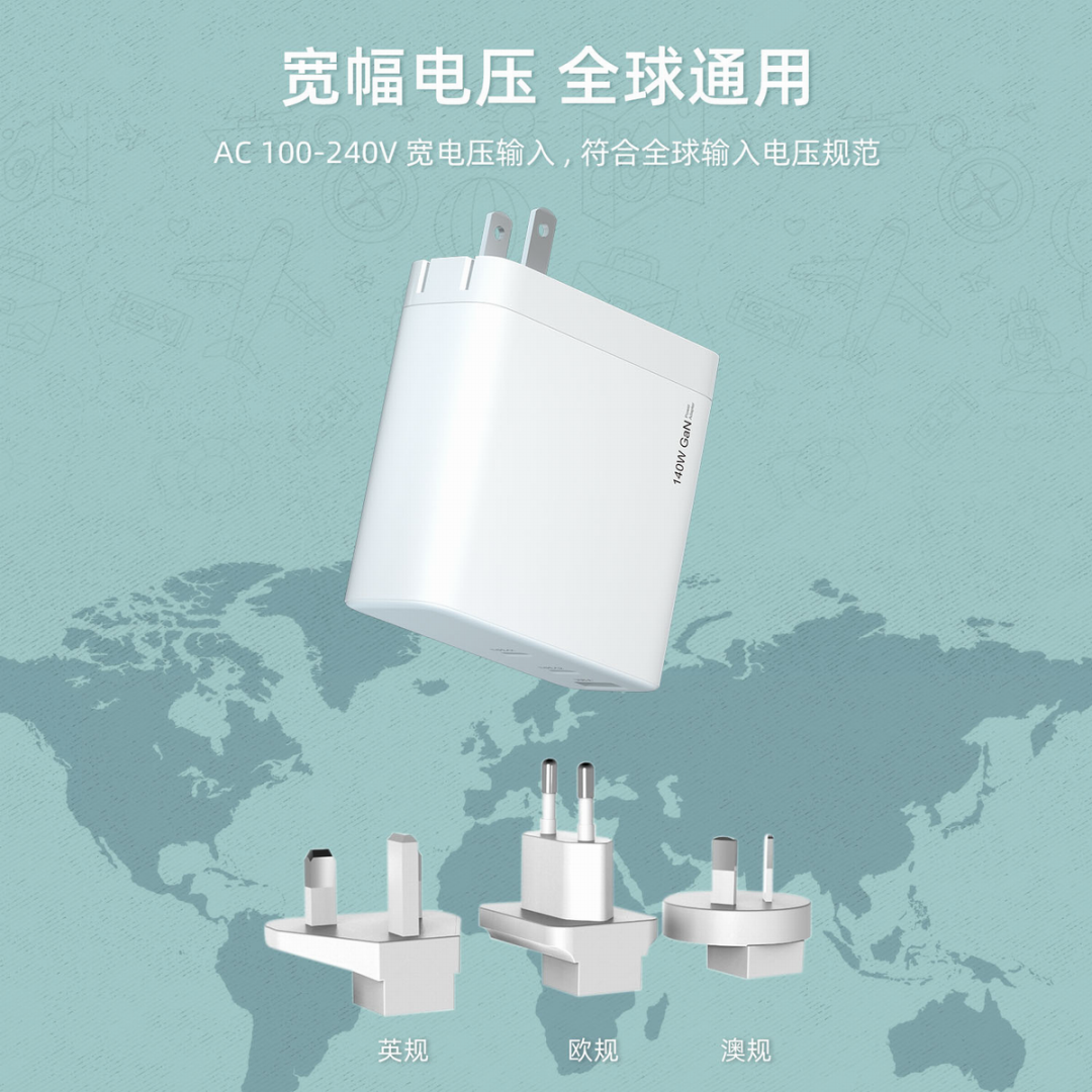 新斯宝 140W双口氮化镓充电器同样适用于全球不同国家地区用户使用,支持 100-240V~50/60Hz 全球电网供电,并配备两脚折叠插脚结构,并支持旅行插脚设计,可转接成英规、欧规、澳规,全球通用。