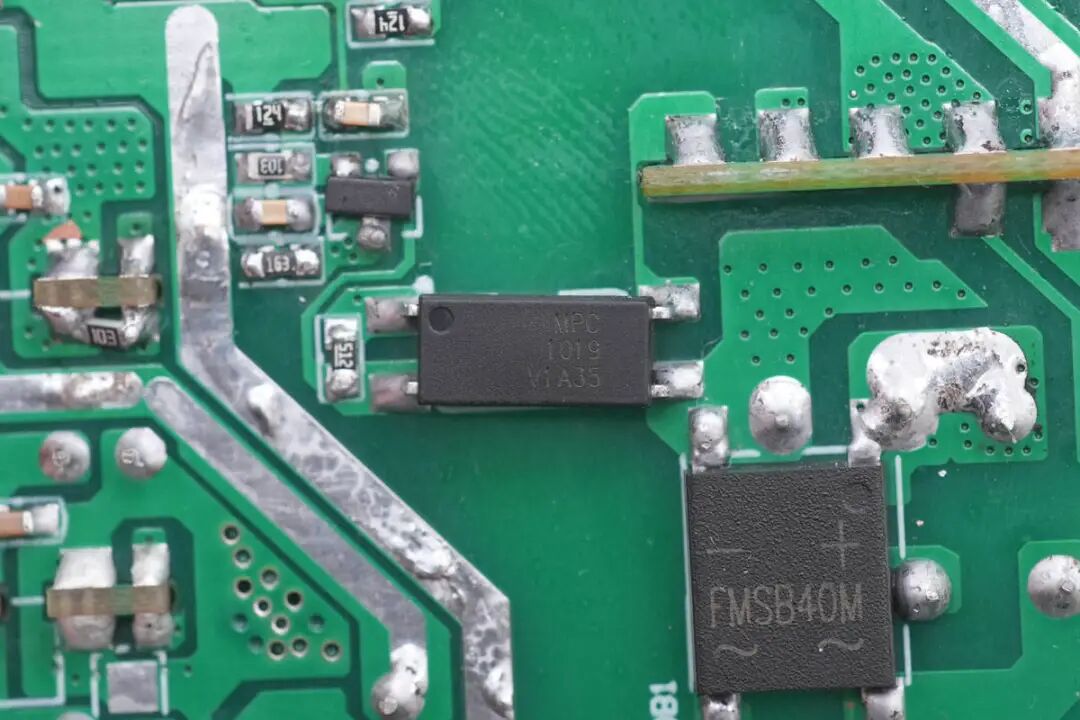 PCBA背面焊接整流桥,光耦,贴片Y电容。右上角为两路同步整流降压转换器,右下角为同步整流控制器和同步整流管。