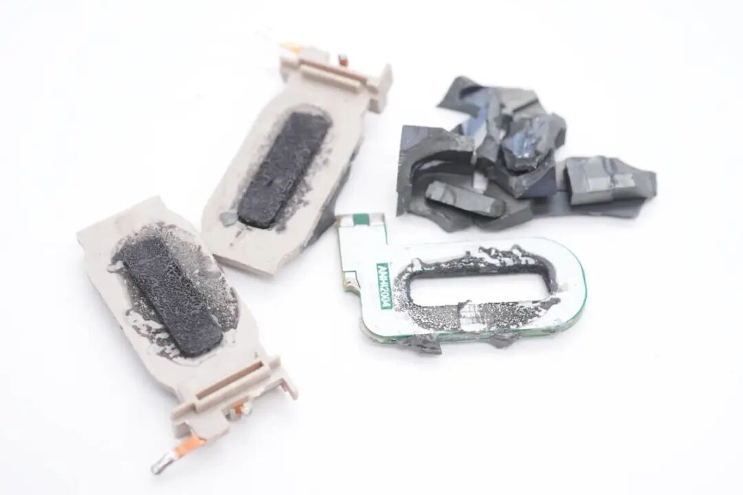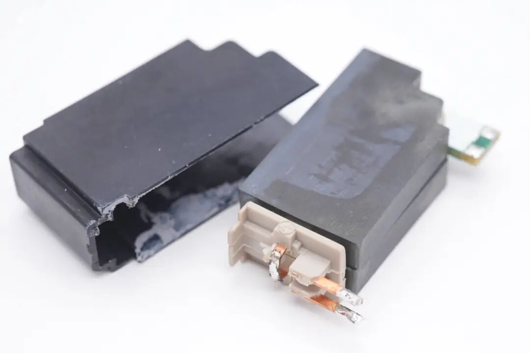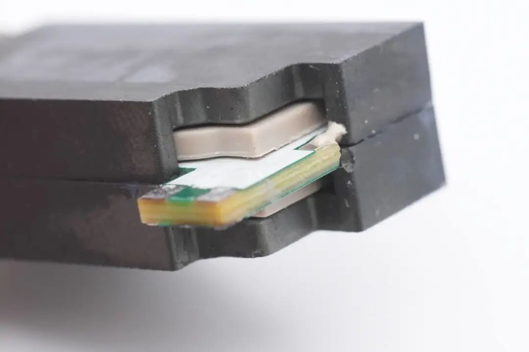 砸开平面变压器磁芯,内部塑封次级绕组和PCB初级绕组特写。
