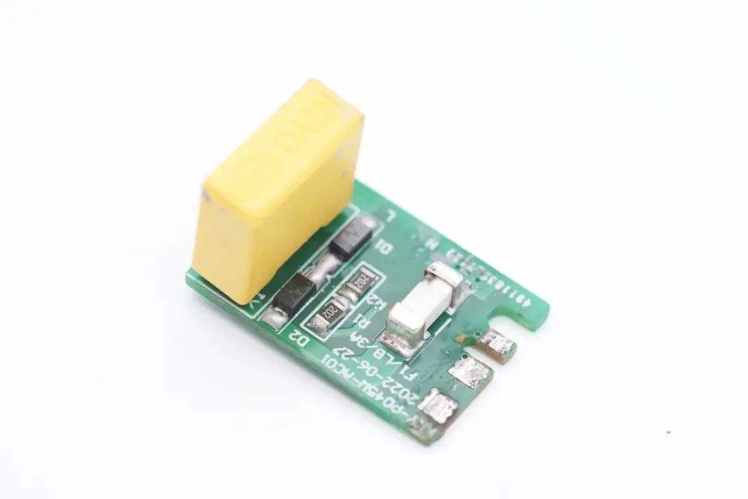 充电器输入端焊接一块小板,小板上焊接保险丝,安规X2电容和用于高压启动及X电容放电功能的二极管和电阻。