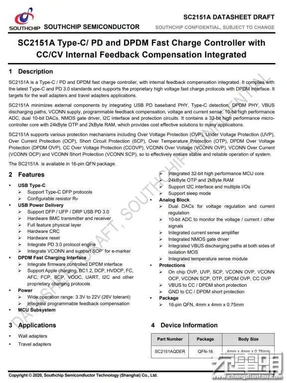 南芯科技 SC2151A 内部集成了 32 位高性能 MCU 内核,集成 24kB 单次编程存储器和 2kB RAM。该控制器针对各类快充协议集成了 USB PD 物理层、Type-C 检测、DP/DM 快充协议物理层,VCONN 供电。
