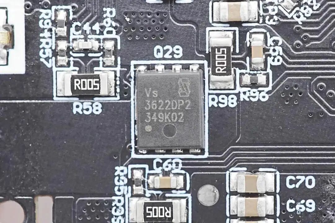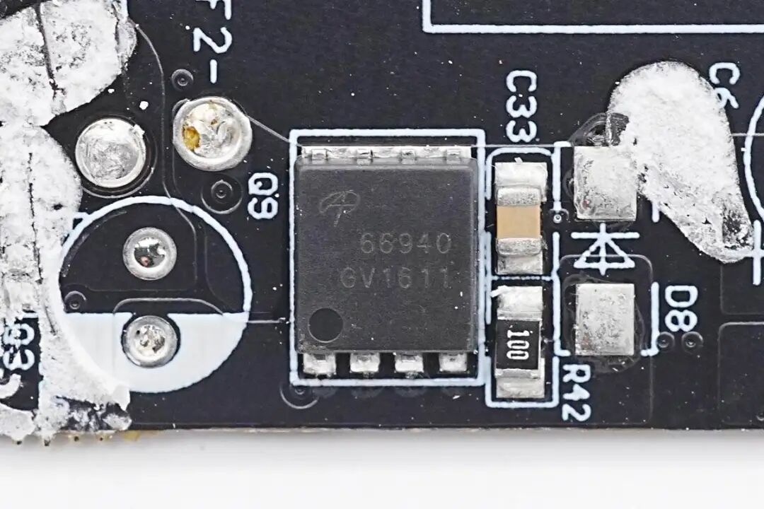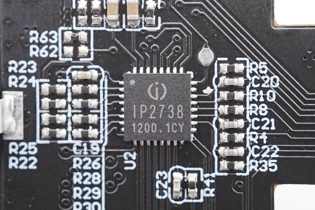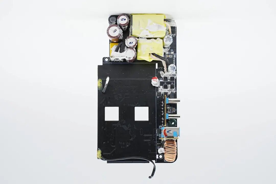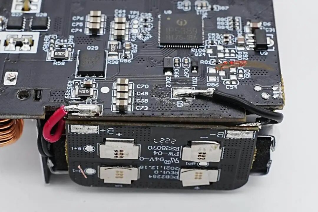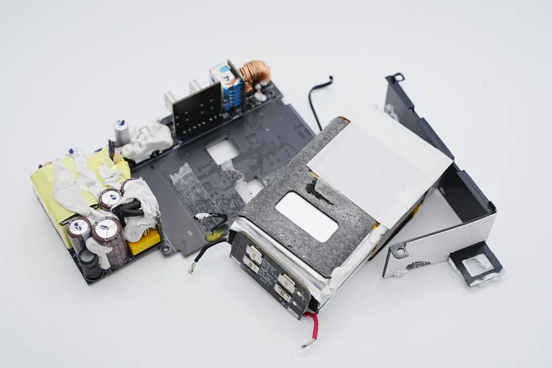 看完了安克这款超极充的开箱和测试,下面就进入到拆解环节,一起来看看内部的用料和设计。在壳体内部粘贴导热垫和石墨散热膜,石墨散热膜粘贴高温胶带绝缘。电池表面粘贴泡棉双面胶固定,并粘贴麦拉片用于绝缘保护电池。在另外一片壳体内部也粘贴导热垫和石墨散热膜,石墨散热膜同样粘贴高温胶带绝缘。按键和指示灯小板通过排线连接到PCBA模块,并通过螺丝固定在外壳上。PCBA模块一览,连接折叠插脚模块和按键指示灯小板。电池焊接到保护板上,保护板通过导线焊接连接到主板上。焊接拆下电池,电池覆盖双面胶和塑料支架,支架起到固定和绝缘作用。电池保护板一览,焊接电池保护芯片和均衡芯片,用于二串电池的过压,欠压,过流保护以及均衡功能。电源内置两串锂电池,单节容量为5000mAh,二串组成10000mAh容量。电池尺寸为11mm厚,43mm宽,72mm长,充电限制电压4.35V,属于高压平台电池。交流输入端焊接一块小板,焊接输入保险丝和EMI元件,输出侧焊接一块小板,焊接两个USB-C母座。在电池侧面焊接两颗热敏电阻,分别用于检测电池和主板的温度。PCBA模块正面一览,顶部焊接输入EMI滤波电路,两颗变压器以及对应的同步整流管和滤波电容,左下角空白区域为电池。电池区域右侧为输出接口和同步升降压电感。PCBA模块背面焊接两颗PI的电源芯片,整流桥,贴片Y电容,英集芯的USB-C协议芯片和一颗升降压主控芯片,分别用于充电器模式协议控制和移动电源模式下升降压输出及协议功能。通过对充电器PCBA模块正反面的观察,安克这款65W二合一氮化镓超极充内置两路反激开关电源,宽电压范围输出,输出电压由协议芯片控制,实现双口独立快充输出。当只有一个接口输出时,自动将两路电源输出并联,满足大功率输出需求。当以电池模式运行时,由升降压主控根据负载需求进行电池电压转换,支持单口快充,为典型的移动电源设计,两套电路互相独立,按照有无交流电源进行切换。下面我们就从输入端开始了解各个元器件的信息。充电器输入端小板焊接保险丝,共模电感和安规X2电容。输入交流电经过保险丝和EMI电路滤波后来到整流桥,整流桥丝印MB50M。在背面还焊接一颗,使用两颗进行整流。高压滤波电解电容来自永铭,其中三颗规格为27μF400V。安克65W氮化镓超极充主控芯片采用PI INN3378C,采用PowiGaN技术,内置PWM控制器、高压MOS、同步整流控制器等,集成度非常高,并且采用数字总线控制调压。宽电压范围条件下,密闭外壳内可以输出55W功率,降额使用。PI官方的资料显示,INN3378C属于InnoSwitch3-Pro家族,它采用了PI独家的PowiGaN技术,也就是内置了GaN氮化镓功率器件,相比传统MOSFET可以输出更大功率。另一颗主控芯片型号为INN3365C,同样为InnoSwitch3-Pro系列,支持适配器中22W宽电压应用,两颗主控芯片配合一大一小变压器组成两路独立的开关电源。贴片Y电容来自四川特锐祥科技股份有限公司,具有体积小、重量轻等特色,非常适合应用于氮化镓快充这类高密度电源产品中。料号为TMY1471K。特锐祥专注于被动元器件的研发、生产及销售,注册资本1亿元。旗下有自主电容品牌两类:SMD TRX及DIP TY电容器,TRX将致力于陶瓷材料的研究,以拓展更多品类的应用,为客户提供更多的解决方案。其中一颗体积较大的变压器搭配INN3378C使用,变压器磁芯采用胶带缠绕绝缘。另一颗体积较小的变压器搭配INN3365C使用,磁芯同样采用胶带缠绕绝缘。用于输出同步整流的MOS管,由PI主控芯片输出的同步整流信号控制,来自AOS万代,丝印66940。另一颗同步整流管丝印相同,均由PI主控控制进行同步整流。对应INN3378C一路的输出滤波电容,来自永铭,为NPT系列固态电容,规格为680μF 25V。对应INN3365C一路的输出滤波电容,规格为470μF 25V。用于输出切换的MOS管,来自杰力,型号为EMB09N03V,是一颗耐压30V的NMOS,导阻为9mΩ,采用EDFN3*3封装。协议芯片采用英集芯IP2738,三个接口输出均由其控制。IP2738是一颗双路协议芯片,支持双口18-140W快充应用,具备独立的反馈控制,具备独立的USB PD控制,相当于两颗IP2736整合到一颗芯片内部,快充规格与IP2736相同。支持USB PD3.1 28V EPR档位,并支持PD3.0/PPS等丰富全面的快充协议,兼容性非常好。英集芯IP2738内置四路独立的NMOS驱动,可用于多个接口输出控制,控制多个VBUS开关管进行输出端口切换以及两路电源并联控制,并且支持双路独立的过流、过压以及短路保护,确保使用安全。这款双模充内置英集芯IP5389移动电源升降压电源管理SOC芯片,将同步升降压控制器与协议功能集成,可实现完整移动电源功能,并支持188数码管电量显示功能,支持2-5串电池应用,可取代传统升降压方案中协议芯片,单片机和升降压控制器多颗芯片组合的方案,大大缩短产品开发周期,降低成本。英集芯IP5389支持USB-A、USB-C口、还支持Micro-USB接口和Lightning接口供电输入,全部接口支持快充。快充协议支持华为FCP、SCP,支持三星AFC,支持OPPO的VOOC,支持PD3.0快充协议,支持PPS,输出最高功率20V5A 100W,可实现全接口丰富的快充支持。IP5389内置升降压控制器,通过驱动外置MOS管,支持双向升降压充放电,支持最大5A充电电流,并且支持自适应电流调节。支持2/3/4/5串电池,并且支持4.2、4.3、4.35、4.4V多种电池。芯片内置电量计,支持4颗LED电量指示,或88/188数码管电量显示,支持通过电阻设定电池容量,或学习电池电量,实现精准的电量显示。同步升降压开关管来自威