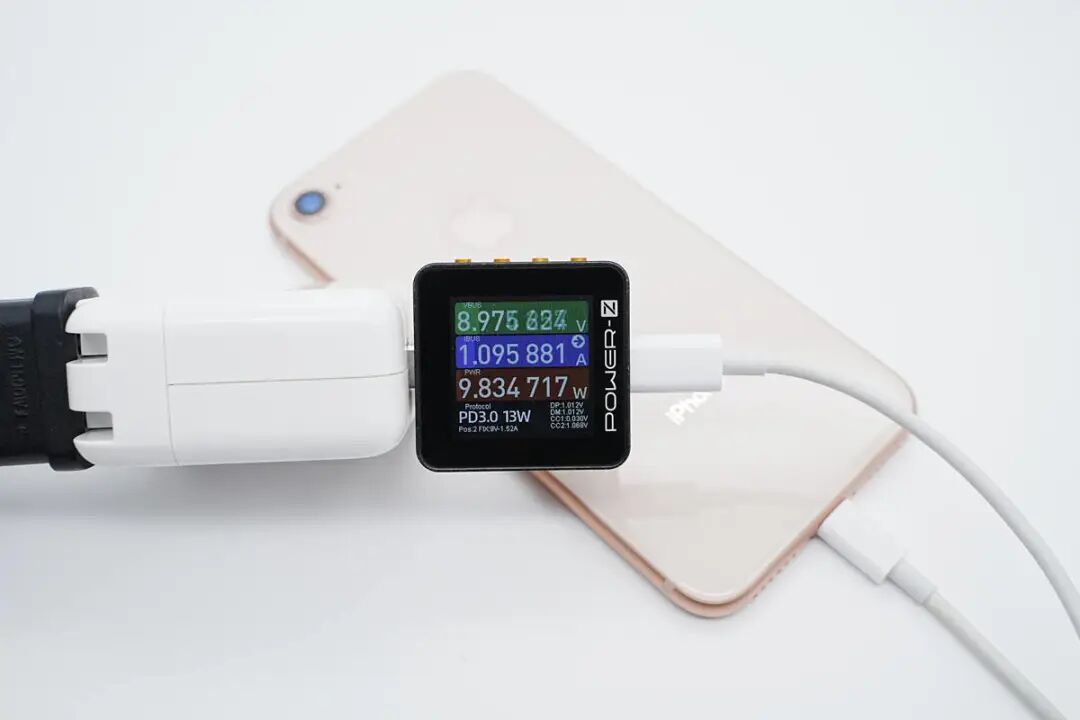 苹果iPhone 8支持PD快充,测得充电功率为8.98V 1.1A 9.83W。