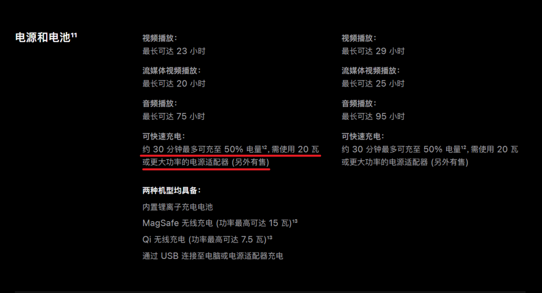 苹果2022年秋季新品发布会比往年提早了一个星期,但依旧是凌晨1点准时进行,此次发布会带来了全新iPhone 14系列,重塑的AirPods Pro以及三款新Apple Watch。其次新机依旧不附送充电器,对于苹果或非苹果用户来说,在经历了iPhone 12和iPhone 13两代产品的“首创”及“坚持”之后,相信也都早已接受。此外发布会上,虽说苹果对新机的充电功率也同样是闭口不谈,但强调了新机的续航能力,提升显著。这样一来,iPhone 14新机充电功率在正式发售前都会是讨论的焦点,至于上限是否会提升虽说不能打包票,但20W和27W PD快充应该还是基本盘,这对于目前的20W和30W快充市场来说,无疑又注入了强大动力,让市场持续发热。下面充电头网就对苹果历代支持快充的手机进行详细盘点,让大家对苹果的快充发展史有全面的了解。最新的iPhone 14系列包括iPhone14、iPhone 14 Plus、iPhone 14 Pro以及iPhone 14 Pro Max,前两款用了去年 iPhone 13 Pro 的 GPU 满血版 A15 仿生处理器,后两款采用 A16 仿生处理器,前主长广四摄都有升级。全系采用Lightning接口,支持PD快充。虽说新机充电功率未公布,但终归不会出现“反向升级”的情况,通过苹果官网搜索也能了解到,iPhone 14系列手机不仅支持快充功能,而且建议用户使用20W或者更大功率的充电器时,30分钟最多可充至50%电量。20W PD快充也成为了苹果官网推荐的手机快充配件。iPhone13系列手机共有四款机型,分别为iPhone 13 Pro Max,iPhone 13 Pro,iPhone 13和iPhone 13 mini。全系内置A15处理器,均采用Lightning接口,支持PD快充。其中Pro机型为三个摄像头,具备长焦摄像头和激光雷达。苹果iPhone 13 Pro Max支持9V3A 27W PD快充,实测充电功率为9.05V 2.95A 26.7W。充电头网还对iPhone 13 Pro Max进行了 5W,18W,20W,30W以及96W五款不同功率的充电器充电测试,并将五种充电全程绘制成曲线图。苹果5W豆腐头的充电速度已经落伍了,1小时才能充电23%,2小时充电46%,完全充满需要5小时。PD快充方面,18W PD充电器半小时充电36%,1小时充电75%,完全充满耗时2小时21分。20W充电器半小时充电42%,1小时充电79%,完全充满耗时2小时11分。30W充电器半小时充电47%,1小时充电82%,完全充满耗时2小时09分。最后苹果96W PD充电器半小时充电48%,1小时充电84%,完全充满耗时1小时49分。苹果iPhone 13 Pro 支持PD快充,实测充电功率为9.03V 2.58A 23.3W。充电头网对iPhone 13 Pro进行相同5款充电器的充电时间测试,并将五种充电全程绘制成曲线图,其中苹果5W豆腐头的充电速度是最慢的,1小时才能充电34%,2小时充电68%,完全充满需要3小时24分钟。PD快充方面,18W PD充电器半小时充电50%,1小时充电85%,完全充满耗时1小时35分。20W充电器半小时充电57%,1小时充电87%,完全充满耗时1小时32分。30W充电器半小时充电58%,1小时充电88%,完全充满耗时1小时34分。最后苹果96W PD充电器半小时充电57%,1小时充电87%,完全充满耗时1小时46分。苹果iPhone 13 支持PD快充,实测充电功率为9.03V 2.67A 23.8W。充电头网对iPhone 13 的五种充电全程曲线图,苹果5W豆腐头1小时才能充电33%,2小时充电65%,完全充满需要3小时40分钟。PD快充阶段,18W PD充电器半小时充电48%,1小时充电82%,完全充满耗时2小时2分。20W充电器半小时充电52%,1小时充电84%,完全充满耗时1小时45分。30W充电器半小时充电54%,1小时充电85%,完全充满耗时1小时44分。最后苹果96W PD充电器半小时充电56%,1小时充电85%,完全充满耗时2小时3分。苹果iPhone 13 mini 支持9V2A 18W PD快充,实测充电功率为8.95V 2A 18W。iPhone 13 mini也是同样使用五款充电器进行充电测试,根据充电器的功率不同,大致分为三条曲线,其中5W小方块1小时充电44%,2小时充电86%,完全充满2小时41分钟。PD快充方面,18W,20W,96W三款充电器的曲线近乎重合,在前30分钟均能为手机充电到60%,1小时充电到88%,完全充满1小时39分钟。30W充电器略快一些,半小时充电62%,1小时充电91%,完全充满耗时1小时21分钟。iPhone12系列手机共有四款机型,分别为iPhone 12 Pro Max,iPhone 12 Pro,iPhone 12和iPhone 12 mini。全系内置A14处理器,均采用Lightning接口,支持PD快充。其中Pro机型为三个摄像头,具备长焦摄像头和激光雷达。苹果iPhone 12 Pro Max支持PD快充,实测充电功率为8.89V 2.52A 22.4W。此前充电头网对iPhone 12 Pro Max做过详细评测,并将五种充电全程绘制成曲线图,苹果5W豆腐头的充电依旧很感人,半小时充电14%,1小时充电27%,完全充满需要4小时29分。12W充电器的充电相较于5W会明显的变快了,半小时充电25%,1小时充电48%,完全充满需要2小时58分,但充电时间还是太长。PD快充阶段,18W PD充电器半小时充电49%,1小时充电83%,完全充满耗时1小时57分。20W充电器半小时充电54%,1小时充电85%,完全充满耗时1小时56分。最后苹果61W PD充电器半小时充电58%,1小时充电88%,完全充满耗时1小时52分。苹果iPhone 12 Pro 支持PD快充,实测充电功率为8.9V 2.49A 22.2W。iPhone 12 Pro 五种充电全程曲线如图,从柱状图的走向来看,5W充电器半小时充电18%,1小时充电36%,完全充满需要3小时25分。12W充电器半小时充电44%,1小时充电61%,完全充满需要2小时13分,虽然相较于5W有很大进步,不过还是很慢。然后是快充组的数据,18W、20W、65W三款PD充电曲线图几乎相同甚至重合,速度方面半小时充电60%左右,1小时充电88%,完全充满需要1小时40分左右。这个速度在业界水平来看,小编坦言并未达到“超速了”的地步,但半小时充入60%这个成绩还是可以的,没电了插上去做其他事情,半小时回来也能回复大部分