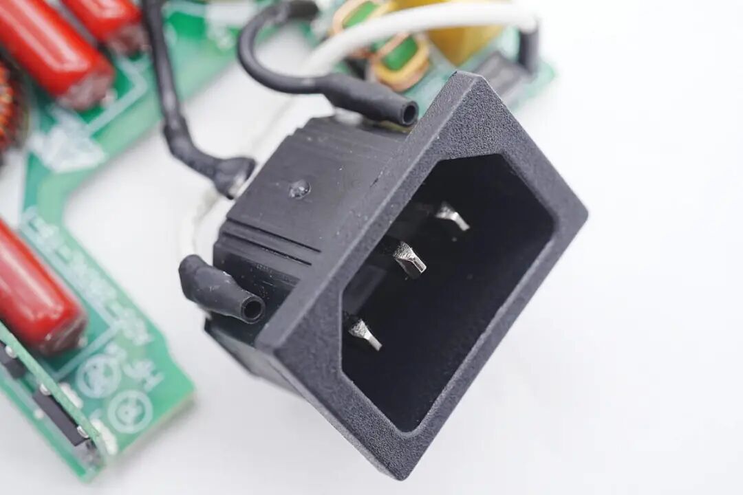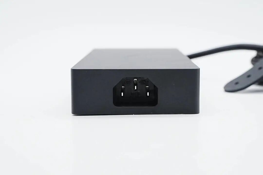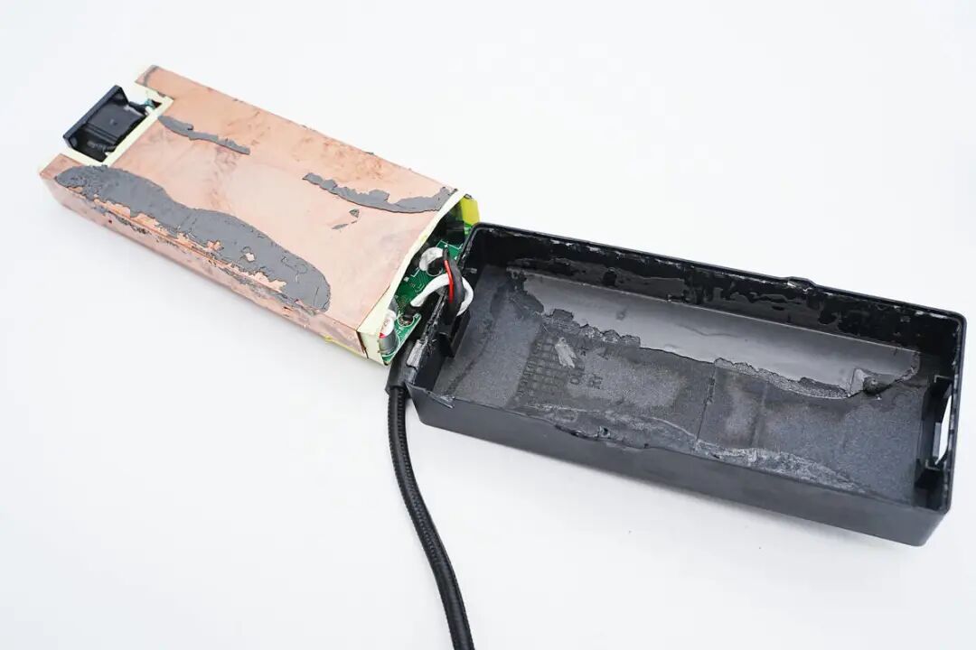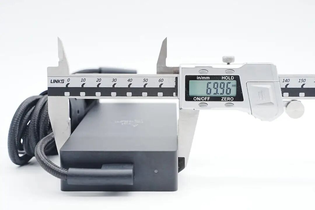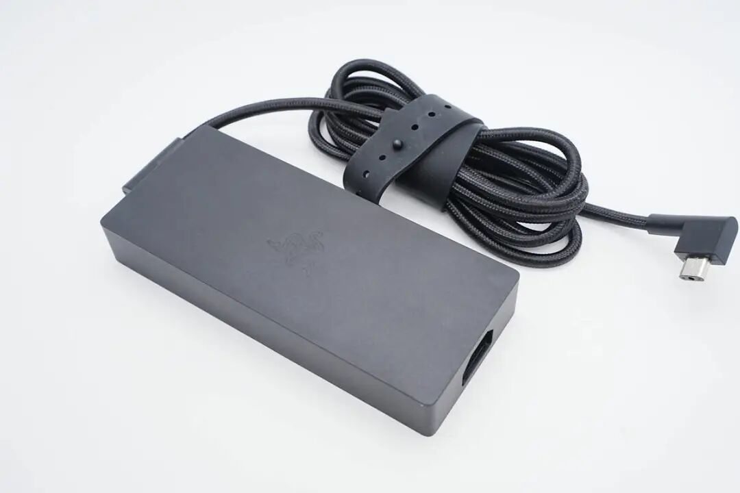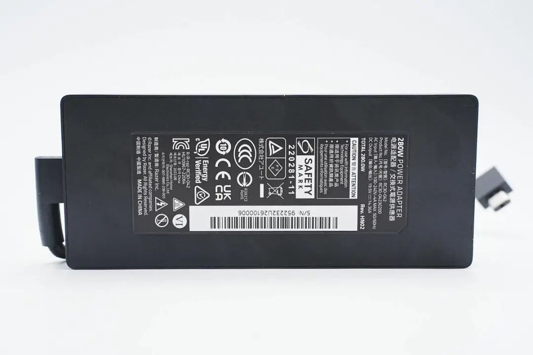 Razer雷蛇是知名的游戏硬件厂商,旗下产品包括高性能游戏外设和Razer Blade灵刃系列笔记本电脑。本次拆解的产品是雷蛇灵刃系列笔记本的一款电源适配器,内置GaN Systems氮化镓器件,体积得到了很好的控制,相比传统的电源体积更小。这款适配器具备280W的输出能力,能够为高性能处理器和显卡提供充足而稳定的电力供应,带来优秀的游戏体验。下面充电头网就对这款电源适配器进行拆解,一起来看看内部的设计和用料。适配器为经典样式设计,电源线可拆卸,机身直板造型外壳磨砂处理,输出线缆采用橡胶带捆扎,而且是黑色编织线,更加耐脏耐用。底部贴有适配器铭牌,通过了CCC、CE、UKCA、UL、PSE、KC等安规认证,还通过了VI级能效认证,铭牌显示该适配器由国内老牌电源企业欧陆通制造。适配器型号为RC30-042,支持100-240V~50/60Hz 4A输入以及19.5V14.36A输出。另一端输出线缆做了90°弯折设计,方便使用,此外旁边设有一颗LED指示灯。线缆端头特写,并不是USB-C接头,为雷蛇笔记本专用的连接器。