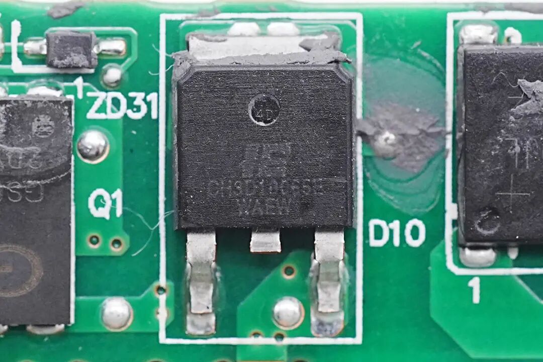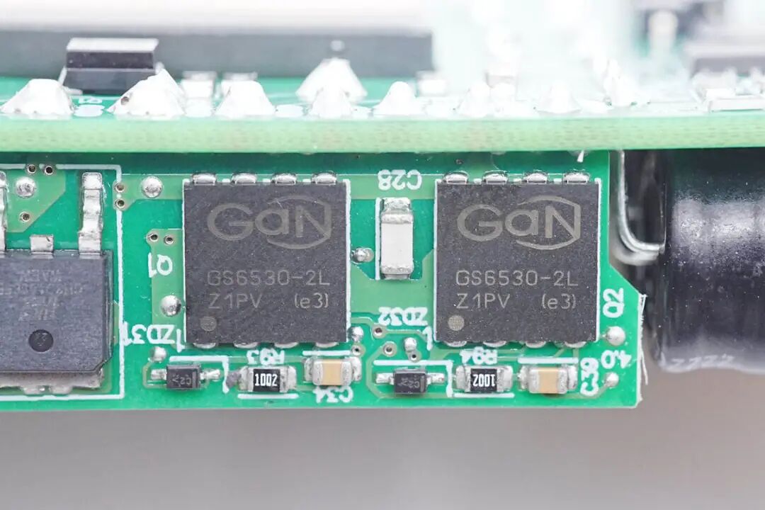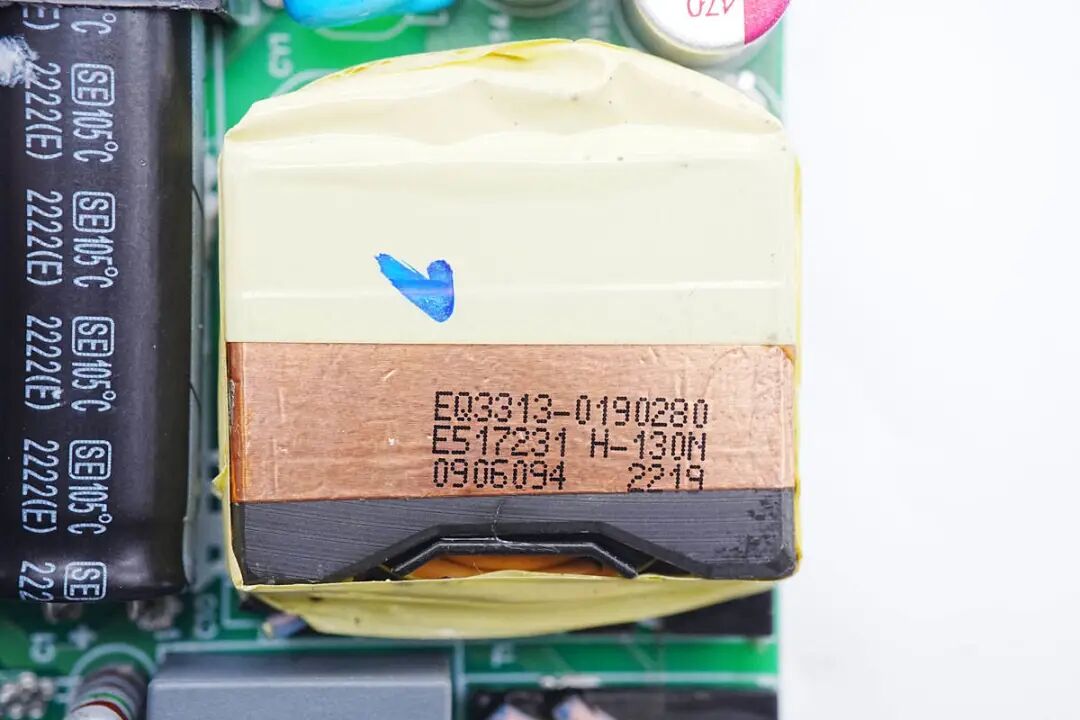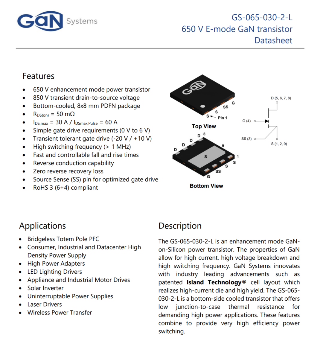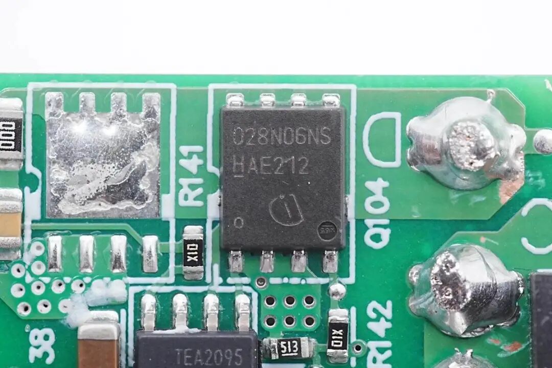 看完了雷蛇这款电源适配器的外观和尺寸测试,下面就进行拆解,看看氮化镓加持的电源适配器内部是如何设计。沿适配器外壳接缝撬开后盖,内部PCBA模块采用纯铜散热片包裹。输出线一览,其中两条白色为正极线芯,黑色为负极,红色细线用于电源功率识别。使用游标卡尺测得PCBA模块长度为156.51mm。拆开PCBA模块上覆盖的散热片,内部PFC升压电感和谐振电感,LLC变压器涂有导热胶,利用散热片散热。在PCBA模块侧面焊接一块小板,小板上焊接整流桥和PFC升压开关管。小板打胶通过纯铜散热片散热。电源适配器PCBA模块正面一览,其中左上角为输出滤波固态电容,在电容右侧是LLC变压器,变压器右侧是谐振电感,在谐振电感下面是PFC升压电感。左下方是高压电解电容。右侧为输入EMI滤波器件,底部小板为输入整流和PFC升压。PCBA模块背面电路相对简单,PCB镂空放置PFC升压电感,降低厚度。在右侧焊接一颗二合一控制器,用于PFC升压和LLC控制。右上方是次级同步整流电路,焊接同步整流控制器和两颗同步整流管。两颗光耦用于输出电压反馈和保护功能。通过对PCBA模块的观察,雷蛇这款电源适配器采用PFC+LLC的高效电源架构,使用一颗控制器同时控制PFC升压和LLC开关电源,固定输出电压为笔记本供电。下面我们就从输入端开始了解各个器件。PCBA模块输入端一览,焊接保险丝,共模电感,安规X2电容。输入端保险丝来自CONQUER功德,MST系列超小型延时保险丝,规格为6.3A 250V,用于输入过流保护。共模电感采用漆包线与绝缘线绕制。底部打胶固定电木板绝缘。电源侧面焊接安规X2电容,共模电感,为主控芯片供电的电解电容,谐振电感,变压器和输出固态电容。第二级共模电感采用磁环绕制,缠绕胶带绝缘,底部粘贴电木板绝缘。PCBA模块侧面焊接小板,小板焊接六颗整流桥和两颗氮化镓器件,以及一颗PFC升压整流管。小板上共焊接六颗整流桥,为半桥连接,均摊发热降低温升。整流桥丝印MB30JL,额定电流3A。整流桥输出的滤波电容来自深圳塑镕,规格为1μF450V。两颗薄膜电容来自深圳塑镕,一颗体积较小的规格为0.47μF450V。两颗PFC升压开关管使用了GaNsystems的两颗GS-065-030-2-L并联,这凸显了GaNsystems的GaN HEMT优秀的可并联性。这是一颗耐压650V,瞬态耐压为850V的增强型氮化镓器件。导阻为50mΩ,采用PDFN8*8封装,支持1MHz以上的超高开关频率。器件在设计时简化了驱动要求,栅极驱动电压为0~6V,瞬态耐压为-20~10V,具有更强的可靠性。器件具备开尔文源极,可用于优化栅极驱动。GaN Systems GS-065-030-2-L 详细资料。由于电源内部的PFC控制器为CCM模式,PFC升压整流管采用一颗碳化硅二极管,利用无反向恢复电流优势,满足CCM模式PFC升压应用。碳化硅二极管来自HOEN富盈,型号为CH3D10065E,是一颗耐压650V的碳化硅二极管,采用TO252封装。在小板背面焊接一颗二极管和磁珠等元件。PCB板为AcePower设计,经查询AcePower是国内老牌电源制造商欧陆通旗下品牌,致力于为高端IT品牌提供定制化电源设计、制造解决方案。PFC升压电感采用EQ3317磁芯,磁芯上缠绕铜箔胶带屏蔽。PCBA镂空放置磁芯,降低整体厚度。两颗高压电解电容来自SUSCON冠坤,规格均为100μF 450V。电源适配器初级主控芯片来自恩智浦,型号为TEA2017AAT,是一款数字化可配置LLC和PFC组合控制器,用于高效谐振电源。芯片包括LLC和PFC控制器功能。PFC经配置可在DCM/QR、CCM固定频率或支持所有操作模式的多模式下运行,优化PFC效率。芯片内部集成高压启动和X电容放电,内部集成驱动器,可直接驱动高压上管,无需外置驱动器。PFC可配置为DCM/QR,DCM/QR/CCM混合模式和CCM固定频率三种运行模式,满足不同功率应用需求。两颗LLC开关管来自东微,型号OSS60R190JF,是一颗耐压650V,导阻为190mΩ的NMOS,属于超级硅产品,具有极低的导通电阻和低栅极电荷,能够降低传导损耗,提升开关性能。两颗为主控芯片供电的电解电容分别为330μF 25V和220μF 25V。LLC谐振电容来自深圳塑镕,规格为0.047μF 630V。变压器采用EQ3313磁芯,对应低压侧使用胶带严密缠绕绝缘。两颗EL1013光耦分别用于输出电压反馈和保护功能。同步整流电路一览,采用两颗同步整流管和一颗同步整流控制器组合用于LLC输出同步整流。次级同步整流控制器采用恩智浦TEA2095T进行同步整流控制,内置两个驱动器,可以同时驱动两个同步整流管,支持LLC应用,并支持独立工作,最高工作频率可达1MHz。芯片支持4.5-38V供电电压,支持逻辑电压驱动的同步整流管。同步整流管来自英飞凌,型号BSC028N06NS,是一颗耐压60V的NMOS,导阻为2.8mΩ,采用SuperSO8封装。电源适配器输出侧一览,焊接固态电容,输出线和指示灯。五颗输出滤波电容,品牌与规格相同,为柏瑞凯RF系列5000小时长寿命固态电容,规格为470μF 25V,用于电源输出滤波。电源次级采用DIODES AP4310E进行输出恒压恒流控制。AP4310E是一颗内置电压基准的双运放,配合取样电阻进行输出电压反馈和输出电流检测。R002取样电阻,采用2512封装,用于输出电流采集。雷蛇这款280W电源适配器,相比传统电源来说,体积显著缩小,体现了氮化镓器件带来的性能提升。电源适配器采用专用插头,配合编织线设计,经久耐用。加入指示灯的设计,可以方便的了解电源的通电状态。充电头网通过拆解了解到,雷蛇这款适配器采用欧陆通为其定制化设计的PFC+LLC架构,内部使用NXP恩智浦TEA2017AAT进行PFC+LLC控制。其中PFC升压开关管采用GaN Systems的GS-065-030