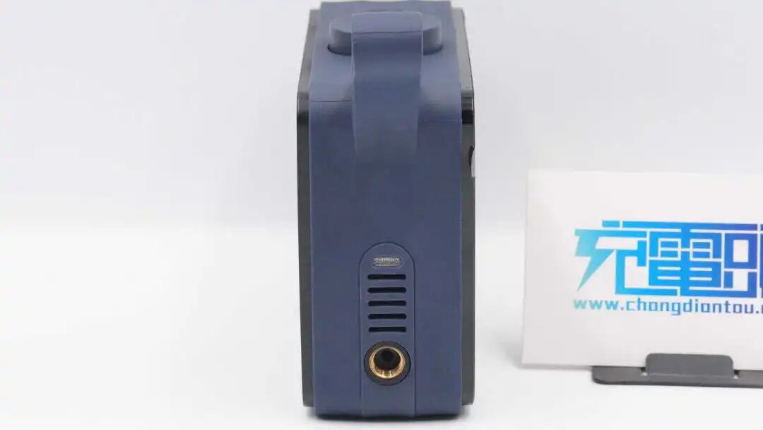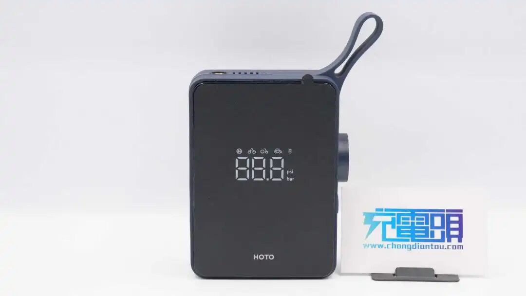 充气宝采用蓝黑色硬塑料壳,侧身是带提手设计的橡胶材质保护套,防摔以及方便携带。机身正面贴有防刮贴纸,印的HOTO品牌以及显示屏功能标识与充气宝的一一对应,让消费者在未购买情况下也能对产品有清楚了解。