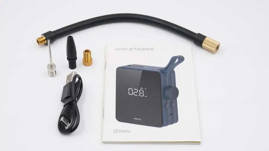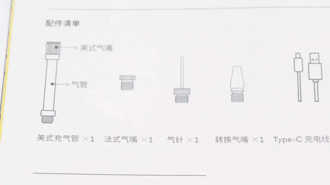 包装内配件一览,包括美式充气管、法式气嘴、气针、转换气嘴、A to C数据线,还有使用说明书。
