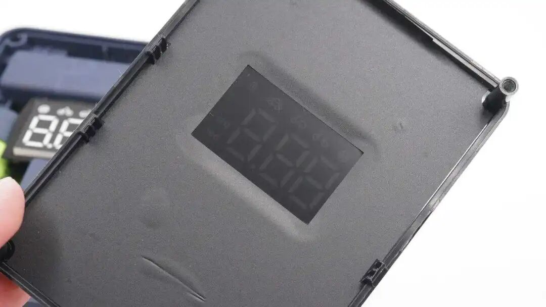 拆下正面的面板,内部是压力显示的LED数码管,电池固定在侧面。