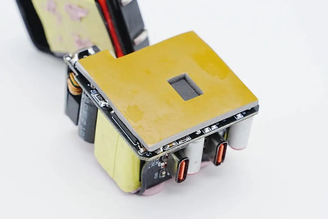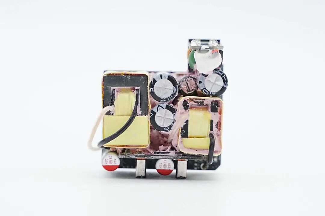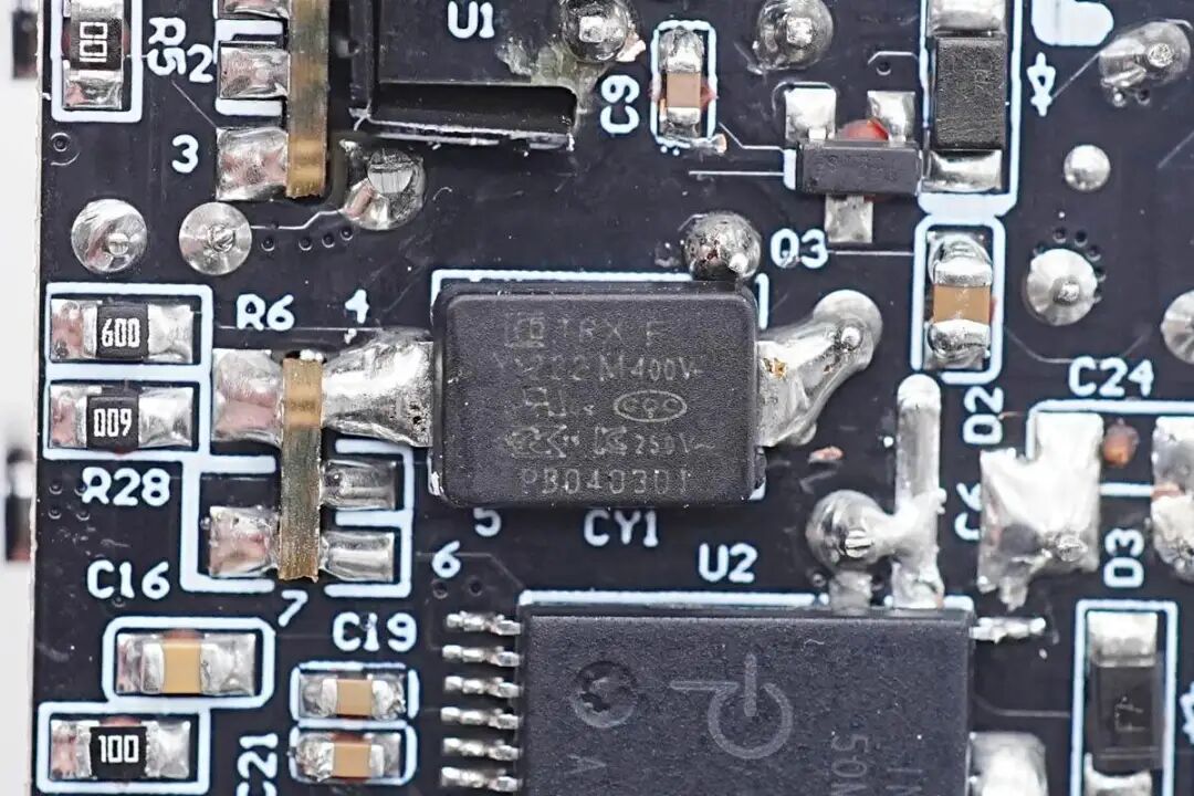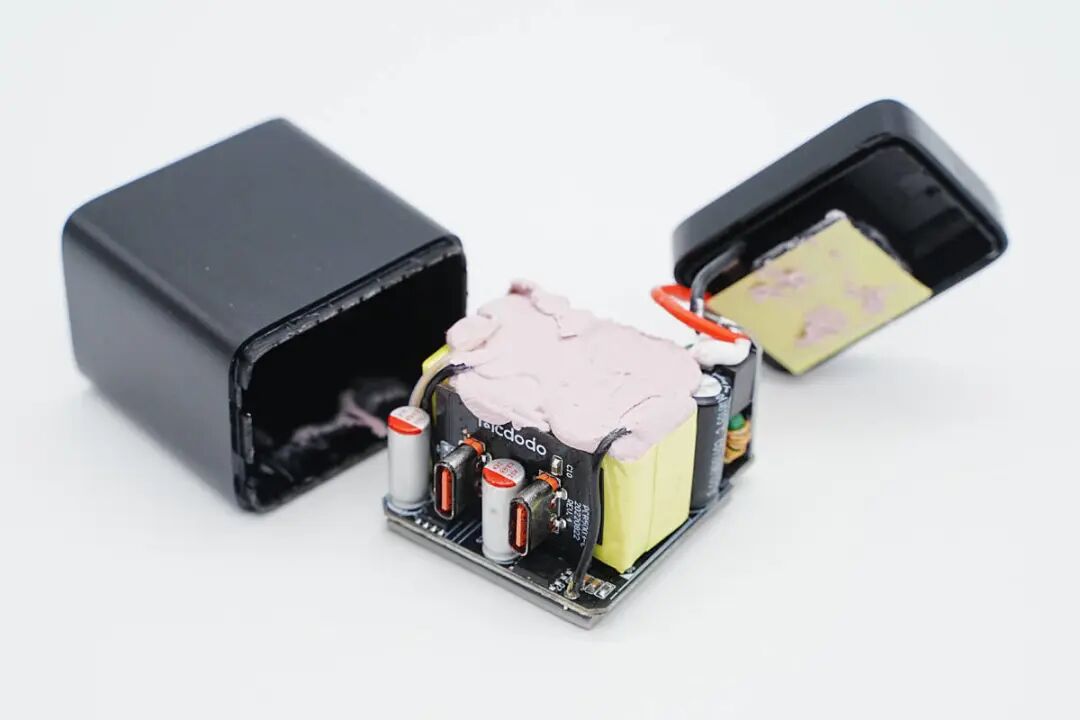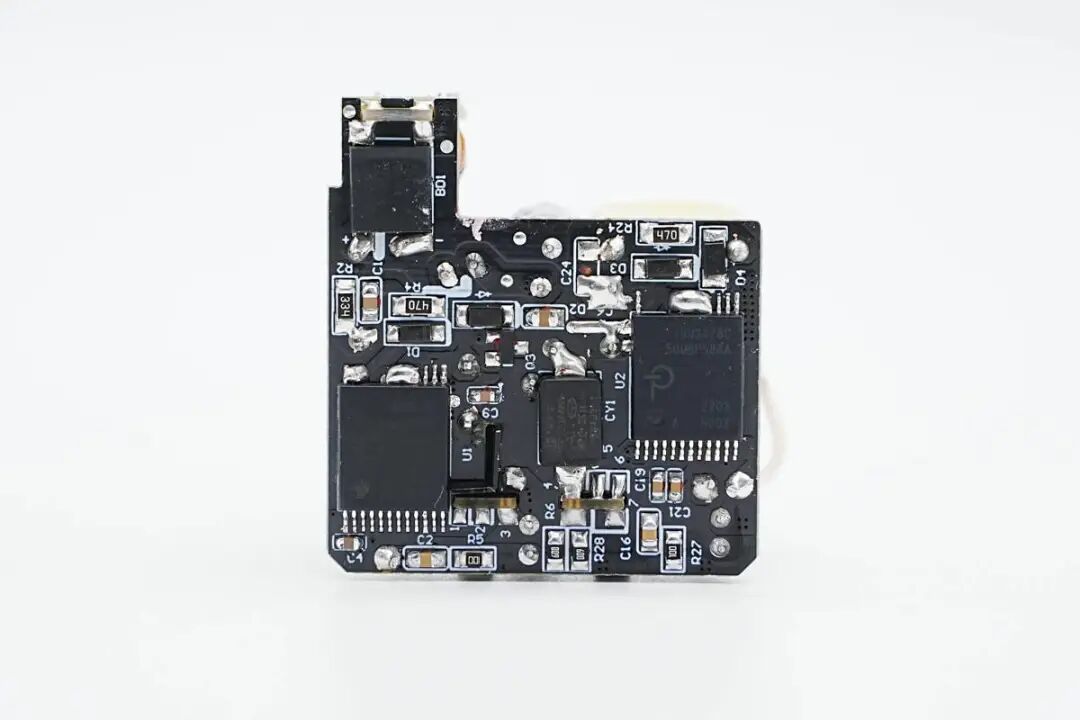 苹果在今年推出了两款双口充电器,具备35W输出功率,能够满足手机和笔记本的同时快充,用户无需携带两个单独的充电器,实用方便,引领了快充的新形态。麦多多推出了一款40W双口PD快充充电器,这款充电器配备了折叠插脚,两个USB-C接口支持功率盲插,单口支持40W输出和PPS快充,双口同时输出时均支持快充,支持智能功率分配,对手机以及笔记本,都能进行快充。下面充电头网就对这款充电器进行拆解,看看内部的设计。包装盒是经典橙白配色,正面印有Mcdodo品牌、充电器外观图、名称以及40W、powiGaN、智能动态功率输出三大卖点。背面印有充电器三维重量,输入输出参数,兼容协议以及CCC认证等信息。麦多多40W氮化镓充电器整体小巧精致,采用PC阻燃材质塑料外壳,通体黑色很有气质。USB-C1/C2:5V3A、9V3A、12V3A、15V2.5A、20V2A充电器配备可折叠国标插脚,携带方便且不会刮伤包里其它设备。输出顶面边缘内凹,亮面设计。此外配有双USB-C输出接口,均为橘红色胶芯。和苹果35W充电器对比,功率更大,体积反倒要更小一些。PDO报文显示C1口还具备5V3A、9V3A、12V3A、15V2.5A、20V2A五组固定电压档位,以及3.3-11V3A一组PPS电压档位。PDO报文也完全相同,两个C口单口输出性能完全相同,支持功率盲插。对麦多多这款40W双口充电器有了基本了解后,下面继续对其进行拆解,看看内部设计和用料如何。沿插脚侧外壳接缝拆开充电器外壳,交流输入通过导线焊接连接,充电器内部PCBA模块采用粉色导热胶填充。取出内部PCBA模块,顶部涂有粉色导热胶填充,加强散热效果。在PCBA模块背面粘贴大面积导热垫,用于均热散热,降低温升。充电器输入端焊接一块小板,焊接保险丝和共模电感,充分利用空间。输出端焊接一块小板,焊接协议芯片和USB-C母座。使用游标卡尺测得PCBA模块长度约为40.31mm。PCBA模块正面一览,充电器布局近似于常见的三段式结构,顶部右上角为高压滤波电容和EMI电路,两侧为一大一小两颗开关变压器,底部单独的小板焊接USB母座,和两颗输出滤波固态电容。PCBA模块背面左上角焊接整流桥,两颗PI的高集成电源芯片,在两颗电源芯片中间焊接一颗贴片Y电容。元器件紧凑排列,空间利用率极高。通过对充电器PCBA模块正反面的观察,麦多多这款40W充电器内置两路反激开关电源,宽电压范围输出,输出电压由协议芯片控制,实现双口独立快充输出。当只有一个接口输出时,自动将两路电源输出并联,满足大功率输出需求。下面我们就从输入端开始了解各个元器件的信息。输入端垂直焊接一块小板,输入导线焊接连接到小板上供电。NTC热敏电阻丝印SCK052,用于抑制充电器插电时的浪涌电流。整流桥来自JF吉福,型号RJBF410,是一颗4A 1000V的快速整流桥,用于将交流电整流为脉动直流电。三颗高压滤波电容来自DKS东科盛电子,规格为22μF 400V。麦多多40W氮化镓充电器主控芯片采用PI INN3378C,采用PowiGaN技术,内置PWM控制器、高压MOS、同步整流控制器等,集成度非常高,并且采用数字总线控制调压。宽电压范围条件下,密闭外壳内可以输出55W功率,降额使用。PI官方的资料显示,INN3378C属于InnoSwitch3-Pro家族,它采用了PI独家的PowiGaN技术,也就是内置了GaN氮化镓功率器件,相比传统MOSFET可以输出更大功率。另一颗主控芯片型号为INN3367C,同样为InnoSwitch3-Pro系列,支持适配器中40W宽电压应用,两颗主控芯片配合一大一小变压器组成两路独立的开关电源。贴片Y电容来自四川特锐祥科技股份有限公司,具有体积小、重量轻等特色,非常适合应用于氮化镓快充这类高密度电源产品中。料号为TMY1222M。特锐祥专注于被动元器件的研发、生产及销售,注册资本1亿元。旗下有自主电容品牌两类:SMD TRX及DIP TY电容器,TRX将致力于陶瓷材料的研究,以拓展更多品类的应用,为客户提供更多的解决方案。两颗同步整流管来自AGMSEMI芯控源,型号为AGM1010AB,是一颗耐压100V,导阻8.2mΩ 的NMOS管。在充电器的输出侧焊接输出小板,小板前面焊接两颗滤波电容。两颗输出滤波电容来自湖南盛通,规格为470μF 25V,两颗分别对应两路输出滤波。输出小板正面有Mcdodo麦多多品牌logo,并焊接两个USB-C母座。小板背面焊接一颗协议芯片,四颗VBUS开关管和对应的电流取样电阻。协议芯片采用英集芯IP2738,三个接口输出均由其控制。IP2738是一颗双路协议芯片,支持双口18-140W快充应用,具备独立的反馈控制,具备独立的USB PD控制,相当于两颗IP2736整合到一颗芯片内部,快充规格与IP2736相同。支持USB PD3.1 28V EPR档位,并支持PD3.0/PPS等丰富全面的快充协议,兼容性非常好。英集芯IP2738内置四路独立的NMOS驱动,可用于多个接口输出控制,控制多个VBUS开关管进行输出端口切换以及两路电源并联控制,并且支持双路独立的过流、过压以及短路保护,确保使用安全。四颗VBUS开关管均来自芯控源,型号AGM306,为NMOS,耐压30V,导阻为5.8mΩ。其中上下两颗用于单口输出控制,中间两颗用于两路输出并联。麦多多40W双口氮化镓快充采用折叠插脚,体积十分小巧,便于携带和收纳。充电器采用黑色外壳,简洁大方。两个USB-C口均支持40W输出,并且支持功率盲插,还支持PPS快充,对于手机和笔记本充电,都有非常好的兼容性,满足日常充电需求。充电头网通过拆解了解到,这款充电器内部采用三块PCB组合焊接,充分利用内部空间。内部采用PI INN3378和INN3367两颗高集成电源芯片搭配两个变压器,组成两路输出的开关电源。输