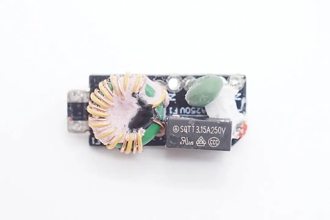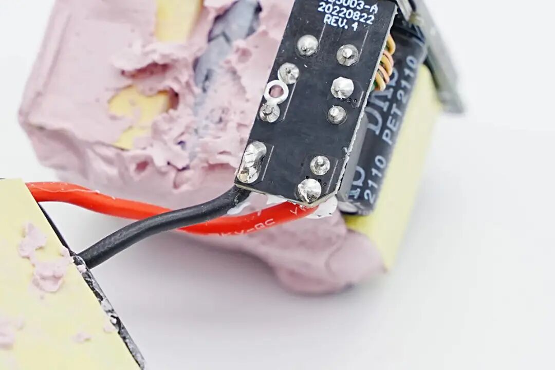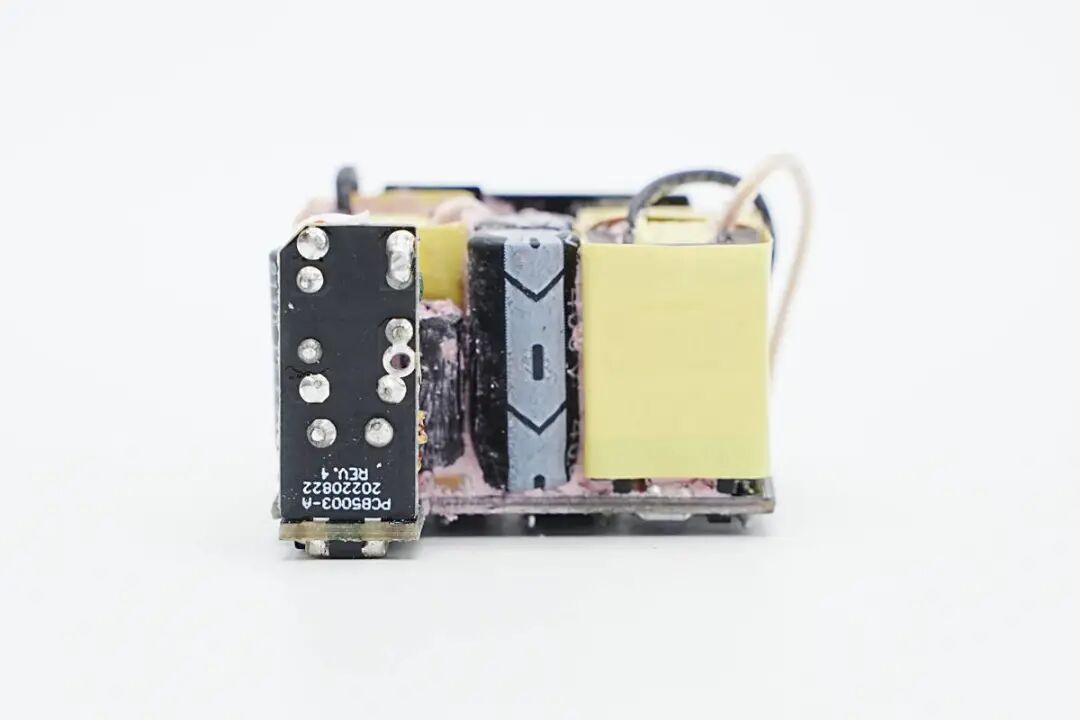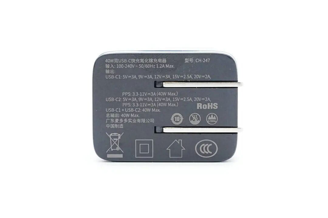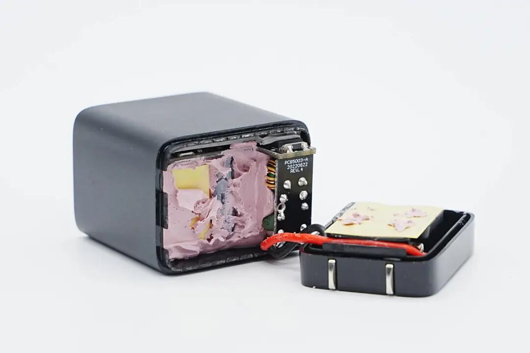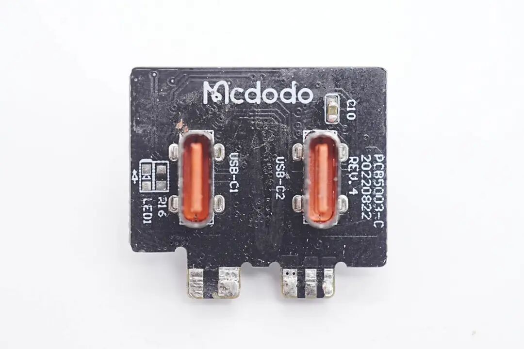 苹果在今年推出了两款双口充电器,具备35W输出功率,能够满足手机和笔记本的同时快充,用户无需携带两个单独的充电器,实用方便,引领了快充的新形态。麦多多推出了一款40W双口PD快充充电器,这款充电器配备了折叠插脚,两个USB-C接口支持功率盲插,单口支持40W输出和PPS快充,双口同时输出时均支持快充,支持智能功率分配,对手机以及笔记本,都能进行快充。下面充电头网就对这款充电器进行拆解,看看内部的设计。包装盒是经典橙白配色,正面印有Mcdodo品牌、充电器外观图、名称以及40W、powiGaN、智能动态功率输出三大卖点。背面印有充电器三维重量,输入输出参数,兼容协议以及CCC认证等信息。麦多多40W氮化镓充电器整体小巧精致,采用PC阻燃材质塑料外壳,通体黑色很有气质。USB-C1/C2:5V3A、9V3A、12V3A、15V2.5A、20V2A充电器配备可折叠国标插脚,携带方便且不会刮伤包里其它设备。输出顶面边缘内凹,亮面设计。此外配有双USB-C输出接口,均为橘红色胶芯。和苹果35W充电器对比,功率更大,体积反倒要更小一些。PDO报文显示C1口还具备5V3A、9V3A、12V3A、15V2.5A、20V2A五组固定电压档位,以及3.3-11V3A一组PPS电压档位。PDO报文也完全相同,两个C口单口输出性能完全相同,支持功率盲插。对麦多多这款40W双口充电器有了基本了解后,下面继续对其进行拆解,看看内部设计和用料如何。沿插脚侧外壳接缝拆开充电器外壳,交流输入通过导线焊接连接,充电器内部PCBA模块采用粉色导热胶填充。取出内部PCBA模块,顶部涂有粉色导热胶填充,加强散热效果。在PCBA模块背面粘贴大面积导热垫,用于均热散热,降低温升。充电器输入端焊接一块小板,焊接保险丝和共模电感,充分利用空间。输出端焊接一块小板,焊接协议芯片和USB-C母座。使用游标卡尺测得PCBA模块长度约为40.31mm。PCBA模块正面一览,充电器布局近似于常见的三段式结构,顶部右上角为高压滤波电容和EMI电路,两侧为一大一小两颗开关变压器,底部单独的小板焊接USB母座,和两颗输出滤波固态电容。PCBA模块背面左上角焊接整流桥,两颗PI的高集成电源芯片,在两颗电源芯片中间焊接一颗贴片Y电容。元器件紧凑排列,空间利用率极高。通过对充电器PCBA模块正反面的观察,麦多多这款40W充电器内置两路反激开关电源,宽电压范围输出,输出电压由协议芯片控制,实现双口独立快充输出。当只有一个接口输出时,自动将两路电源输出并联,满足大功率输出需求。下面我们就从输入端开始了解各个元器件的信息。输入端垂直焊接一块小板,输入导线焊接连接到小板上供电。NTC热敏电阻丝印SCK052,用于抑制充电器插电时的浪涌电流。整流桥来自JF吉福,型号RJBF410,是一颗4A 1000V的快速整流桥,用于将交流电整流为脉动直流电。三颗高压滤波电容来自DKS东科盛电子,规格为22μF 400V。麦多多40W氮化镓充电器主控芯片采用PI INN3378C,采用PowiGaN技术,内置PWM控制器、高压MOS、同步整流控制器等,集成度非常高,并且采用数字总线控制调压。宽电压范围条件下,密闭外壳内可以输出55W功率,降额使用。PI官方的资料显示,INN3378C属于InnoSwitch3-Pro家族,它采用了PI独家的PowiGaN技术,也就是内置了GaN氮化镓功率器件,相比传统MOSFET可以输出更大功率。另一颗主控芯片型号为INN3367C,同样为InnoSwitch3-Pro系列,支持适配器中40W宽电压应用,两颗主控芯片配合一大一小变压器组成两路独立的开关电源。贴片Y电容来自四川特锐祥科技股份有限公司,具有体积小、重量轻等特色,非常适合应用于氮化镓快充这类高密度电源产品中。料号为TMY1222M。特锐祥专注于被动元器件的研发、生产及销售,注册资本1亿元。旗下有自主电容品牌两类:SMD TRX及DIP TY电容器,TRX将致力于陶瓷材料的研究,以拓展更多品类的应用,为客户提供更多的解决方案。两颗同步整流管来自AGMSEMI芯控源,型号为AGM1010AB,是一颗耐压100V,导阻8.2mΩ 的NMOS管。在充电器的输出侧焊接输出小板,小板前面焊接两颗滤波电容。两颗输出滤波电容来自湖南盛通,规格为470μF 25V,两颗分别对应两路输出滤波。输出小板正面有Mcdodo麦多多品牌logo,并焊接两个USB-C母座。小板背面焊接一颗协议芯片,四颗VBUS开关管和对应的电流取样电阻。协议芯片采用英集芯IP2738,三个接口输出均由其控制。IP2738是一颗双路协议芯片,支持双口18-140W快充应用,具备独立的反馈控制,具备独立的USB PD控制,相当于两颗IP2736整合到一颗芯片内部,快充规格与IP2736相同。支持USB PD3.1 28V EPR档位,并支持PD3.0/PPS等丰富全面的快充协议,兼容性非常好。英集芯IP2738内置四路独立的NMOS驱动,可用于多个接口输出控制,控制多个VBUS开关管进行输出端口切换以及两路电源并联控制,并且支持双路独立的过流、过压以及短路保护,确保使用安全。四颗VBUS开关管均来自芯控源,型号AGM306,为NMOS,耐压30V,导阻为5.8mΩ。其中上下两颗用于单口输出控制,中间两颗用于两路输出并联。麦多多40W双口氮化镓快充采用折叠插脚,体积十分小巧,便于携带和收纳。充电器采用黑色外壳,简洁大方。两个USB-C口均支持40W输出,并且支持功率盲插,还支持PPS快充,对于手机和笔记本充电,都有非常好的兼容性,满足日常充电需求。充电头网通过拆解了解到,这款充电器内部采用三块PCB组合焊接,充分利用内部空间。内部采用PI INN3378和INN3367两颗高集成电源芯片搭配两个变压器,组成两路输出的开关电源。输