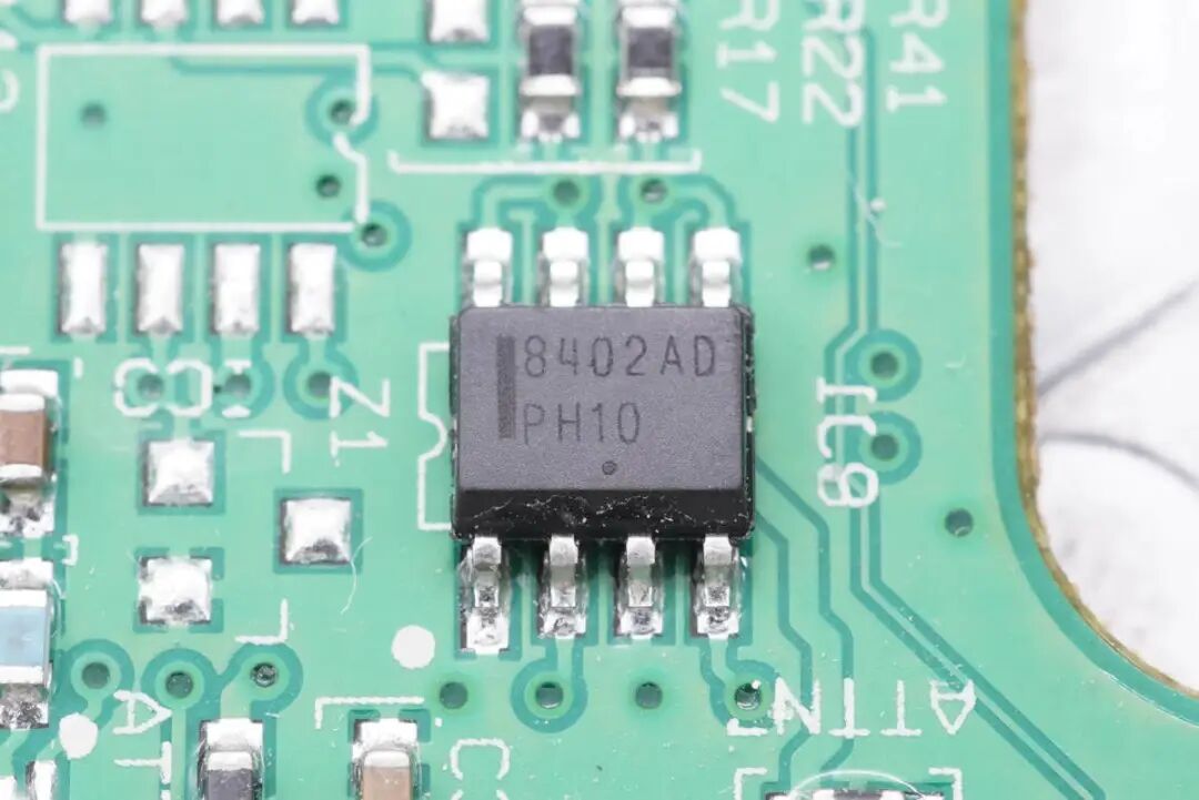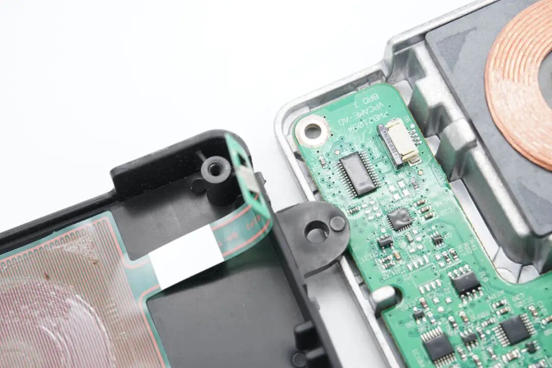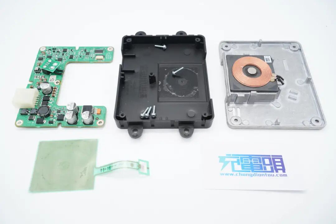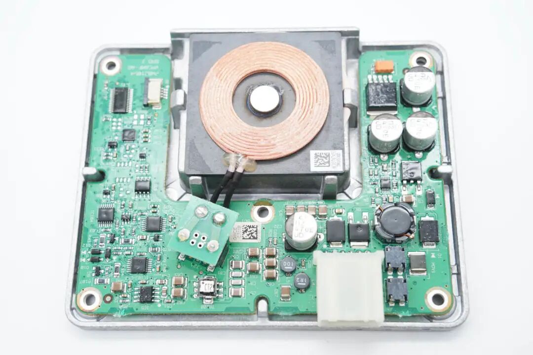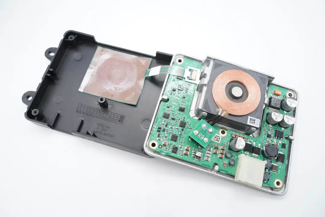 看完了伟世通这款无线充电模块的外观展示,下面进入拆解环节,一起看看内部是如何设计的。上盖内部一览,对应无线充电线圈的位置粘贴了一片电容检测贴片,电容检测贴片用于检测手机是否放入,自动开启无线充电功能。在下面的铝合金外壳内部是无线充电线圈和PCBA模块。无线充电线圈的隔磁片粘贴到铝合金外壳内部进行散热。PCBA模块正面一览,左侧焊接电容,电感以及稳压芯片,右侧焊接主控芯片,运放等元件。PCBA模块背面焊接一片金属片,用于与外壳连接接地。PCBA模块正反面均涂有三防漆,起到保护作用。这款无线充电器与主流的充电器不同,其采用了半桥加升压电路的组合,没有采用常见的全桥+升降压结构。一定程度上可以降低成本。下面我们从输入端开始了解这款无线充电器的用料与设计。输入端一颗升压控制器来自TI德州仪器,丝印4210Q,实际型号为TPS40210-Q1,是一颗支持52V输入电压的电流模式升压控制器,用于将输入供电升压为无线充电电路供电。无线充整板共焊接四颗滤波电容,均来自NICHICON尼吉康,规格为470μF 25V,为UUD系列,符合AEC-Q200认证。安森美 NCV4275A 5V450mA LDO,用于为无线充电模块内部的芯片供电。输出滤波电容来自AVX,为汽车用氧化铌电容,满足AEC-Q200要求,失效时为高电阻状态,不燃烧,规格为47μF 6V。一颗MCU来自NXP,型号MC9S08EL32,是一颗8位单片机,内置32K Flash和1K RAM。另一颗单片机来自SILICON芯科,型号位C8051F553,是一颗混合信号单片机,采用QFN24封装,符合AEC-Q100标准。单片机右上角是一颗TI的芯片,丝印ACYU,实际型号为SN74AHC1G86-Q1,是一颗汽车应用的单路二输入异或门,采用SOT23封装。一颗集成MOS来自安森美,型号NCV8402AD,是一颗内置保护的智能分立器件,内部集成过电流,过热和门极保护的ESD以及钳位电路,用于严苛的汽车环境。无线充PCBA上还焊接了三颗TI德州仪器的运放芯片,清理掉上面的胶水,可以看到丝印OP4348Q,实际型号为OPA4348-Q1,是一颗符合AEC-Q100标准的四运放,支持轨对轨输入和输出,用于无线充电解调功能。一颗单刀双掷开关来自TI德州仪器,丝印UAAQ,实际型号为TS5A3159,是一颗模拟开关,用于不同信号输入切换。无线充电功率级采用MPS MPQ8039 高电流半桥驱动器,支持7.5~25V工作电压,支持9A峰值电流输出,支持4.25A连续电流输出,支持1.2MHz开关频率,内部集成电流限制,欠压保护和过热保护,支持半桥和全桥应用,采用SOIC8E封装,底部焊接散热焊盘。安森美 NVD2955是一颗耐压60V的PMOS,导阻为155mΩ,采用DPAK封装。一颗电流传感器芯片来自TI德州仪器,丝印BOG,实际型号为INA193-Q1,用于电流检测放大。伟世通这款无线充电器与主流的充电器不同,常见的无线充均采用了全桥+升降压结构,而这款采用的是半桥加升压电路的组合,线圈中心放置一颗磁铁,与常见的无线充电器有很大不同。充电头网通过拆解了解到,这款无线充内部全部采用车规级元件,采用NXP恩智浦和SILICON芯科MCU进行整机控制,使用TI德州仪器TPS40210-Q1升压芯片将输入电压升压,并使用三颗OPA4348-Q1运放芯片进行解调,使用MPS芯源半导体MPQ8039进行线圈驱动。无线充PCB采用三防漆保护,内部用料十分豪华。![]()