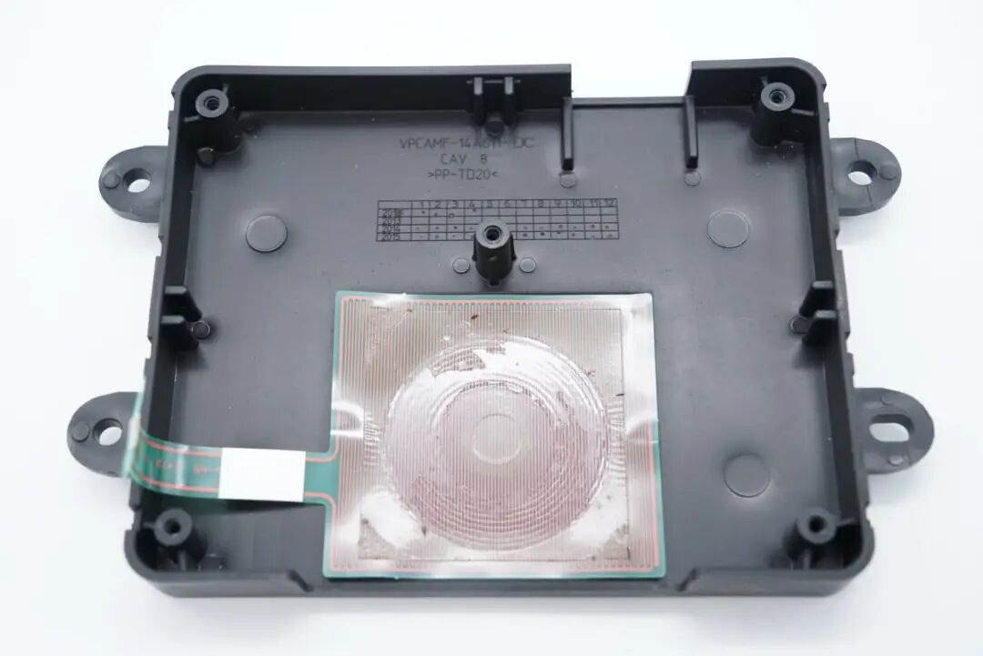 最近充电头网淘到了上海伟世通汽车电子系统有限公司的一款汽车前装手机无线充电模块,外壳有些磨痕,看上去有些老旧,毕竟是2015年出的东西。不过本期拆解的初衷也只是想向大家展示产品的做工用料,并丰富充电头网的拆解案例。下面就一起来看看吧。这款汽车前装无线充电模块顶部为PC材质塑料外壳,两侧设有固定槽,顶面方块区域磨砂处理,看上去有些发白,是无线充电区域,手机放在该区域便可进行无线充电。底部是一体式金属散热板,上下两部分外壳通过螺丝封装固定。散热板对应无线充电区域设有7道凹槽,增加散热面积更好散热。重量约为260g。