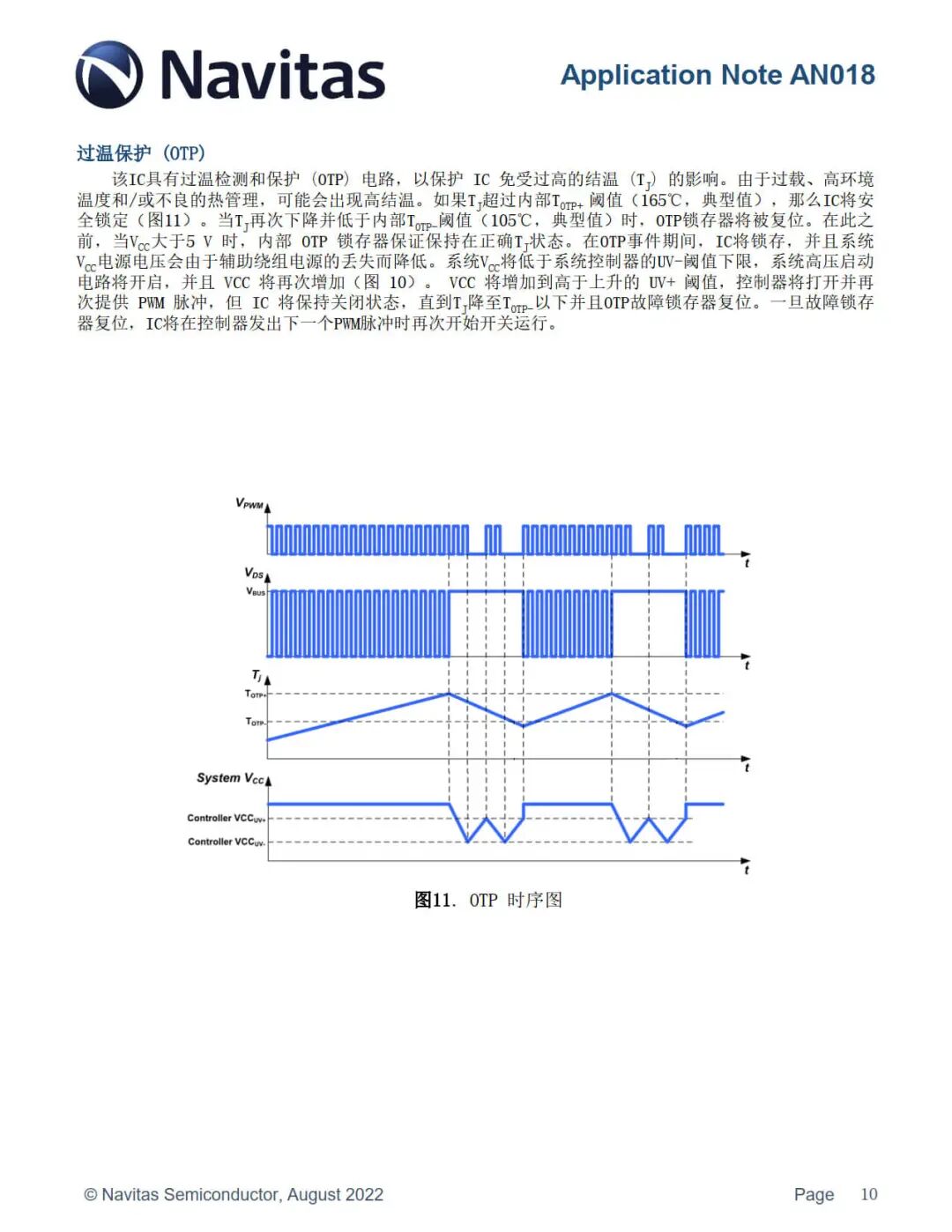 纳微 NV624x 具有过温检测和保护 (OTP) 电路,以保护 IC 免受过高的结温 (TJ) 的影响。由于过载、高环境温度和/或不良的热管理,可能会出现高结温。