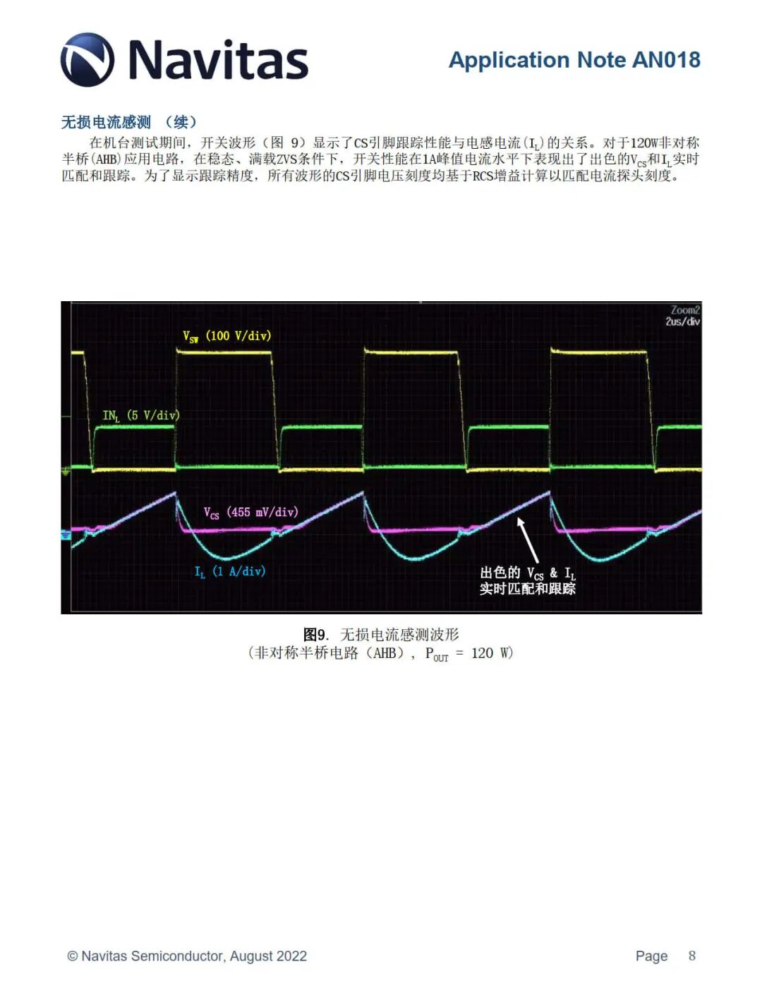 在机台测试期间,上图的开关波形显示了 CS 引脚跟踪性能与电感电流(IL)的关系。对于 120W 非对称半桥(AHB)应用电路,在稳态、满载 ZVS 条件下,开关性能在 1A 峰值电流水平下表现出了出色的 VCS 和 IL 实时匹配和跟踪。为了显示跟踪精度,所有波形的 CS 引脚电压刻度均基于 RCS 增益计算以匹配电流探头刻度。