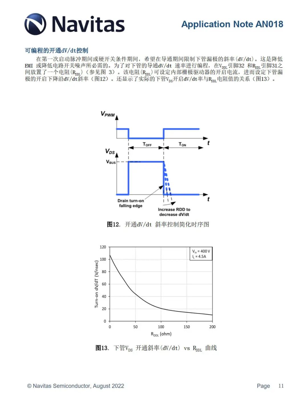 在第一次启动脉冲期间或硬开关条件期间,希望在导通期间限制下管漏极的斜率(dV/dt)。这是降低 EMI 或降低电路开关噪声所必需的。