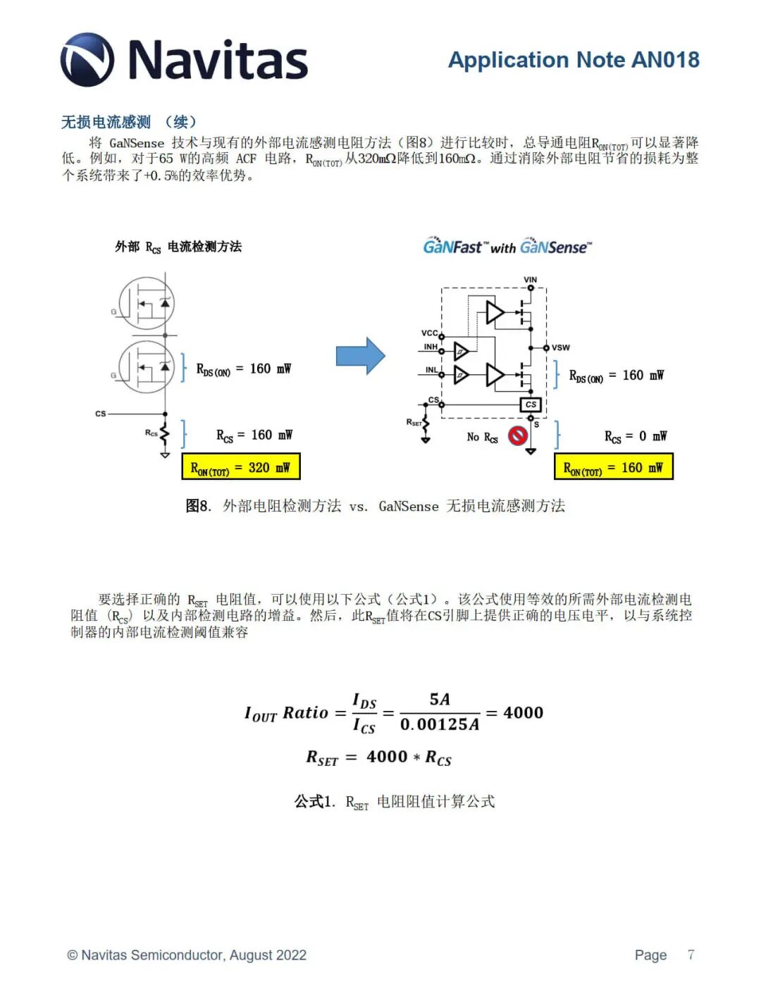 为了消除外部电阻和热点并提高系统效率,纳微 NV624x 集成了精确且可编程的无损电流感测。流经下管的IDS电流在内部被感测,然后被放大、trim 并在电流感测输出引脚 (CS) 处转换为电流。外部电阻 (RSET) 从 CS 引脚连接到 PGND 引脚,用于设置 CS 引脚电压信号的幅度。这允许对 CS引脚信号进行编程,以与具有不同电流感测输入阈值的不同控制器一起工作。