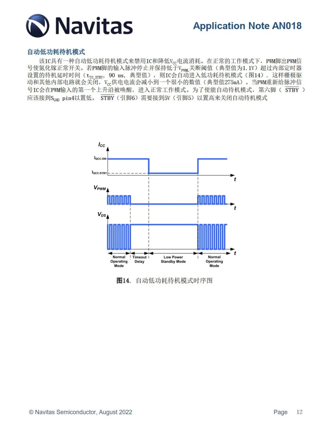 纳微 NV624x 具有一种自动低功耗待机模式来禁用IC和降低VCC电流消耗。在正常的工作模式下,PWM脚出PWM信号使氮化镓正常开关。